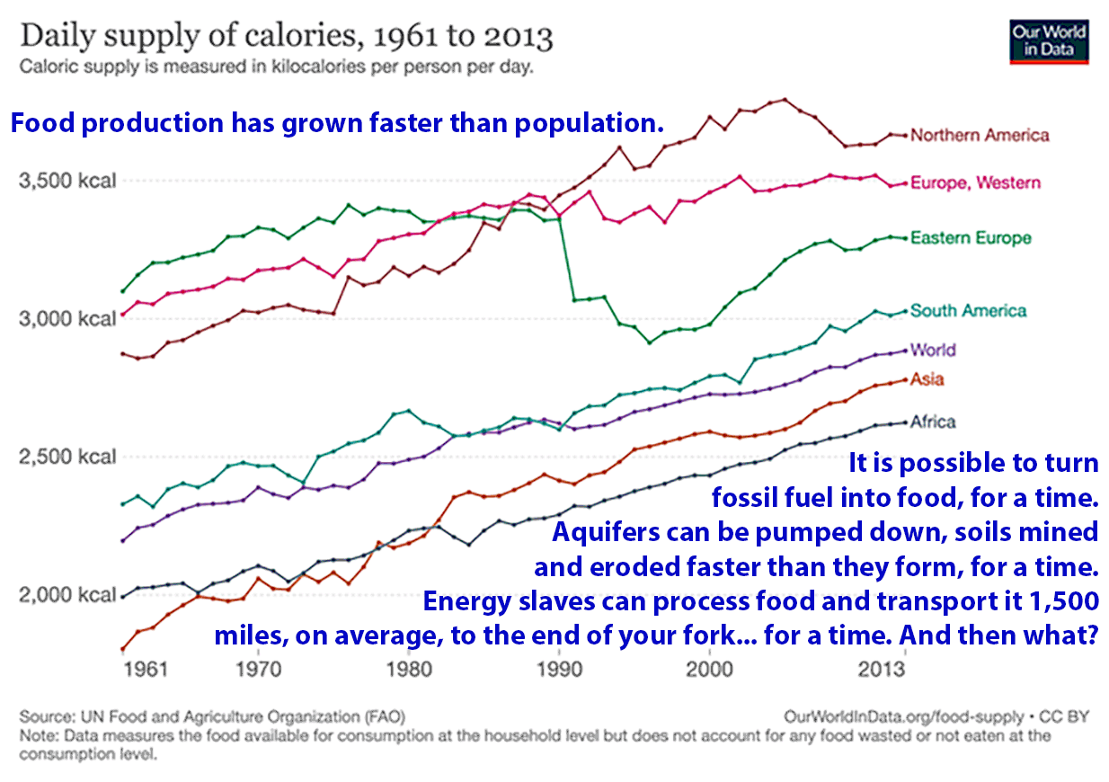 In the past eighty years the increase in the rate of food production (of turning fossil fuel into food) has been greater than population growth, which Malthus failed to foresee. The Ehrlichs (the ag experts they consulted) failed in 1968 to foresee the Green Revolution which selected cultivars that could thrive in the environment that fossil-fueled industrial agriculture could create (for a time). Without industrial inputs, the Green Revolution crops will not be used and heirloom crops will, so in areas that currently produce over 200 bushels/acre of corn/maize, good farmers may again get 20-25 bushels/acre average yield for 1-2 years on cleared land followed by 15-25 year fallow period on rainwatered land, or where alternative energy is available it can be turned into food, but not anywhere near on the scale that fossil fuels allowed for a time (for corn as an example, figure 20 bushels/year x 2 years every 20 years, or 2 bushels/year vs 200 bushels/year when fossil fuels were turned into food, for a time), and electricity is of higher transformity, too high to be turned into food, as there may be too little to support information technology). To "seek out the condition now that will come anyway", rapidly degrow the population via managed descent. Create pockets of sustainability within which the fertility rate is dramatically reduced initially, regions where individuals with foresight intelligence can self-select into. See Watershed Design Principles.
