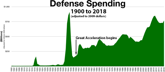 [Not included above-right: nuclear weapons research, maintenance, cleanup, production, payments in pensions to military retirees and widows/families, interest on debt incurred in past wars, or State Department financing of foreign arms sales and militarily-related development assistance, nor does it include non-military defense spending such as the Department of Homeland Security, counter-terrorism spending by the FBI and intelligence-gathering spending by NSA. Basically nation-state empire-building ended with WWII, so the price of keeping on keeping on has been high. The Sino was the region for the taking in the sixteenth to twentieth centuries for Portuguese, Spanish, British, Russian, American, French and Japanese empire-builders, and after a bit of Mao, was subsumed into the Euro-Sino Empire of commerce to become the center of the Growth Hegemon in the 1990s, growing their economy, stupid, at 7 to 10 percent per year—doubling their growth economy every 7 to 10 years, skipping the nation-state empire-building phase. Established patterns tend to keep on keeping on, however. WWII was a missed opportunity for understanding the dynamics of the world system in terms of what could work in the long-term scheme of things. The intelligentsia today is as clueless (as inecolate) as those who, post-WWII, came up their Universal Declaration of Human Rights and later the Sustainable Development memes to better define how humans, elites and commoners, are to serve the SYSTEM, just as the schoolmen worked 600 years to serve their Feudal SYSTEM.]