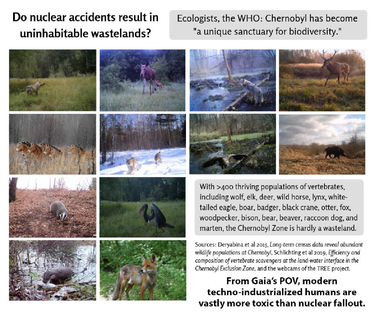 But in just a few decades, life on Earth will be doing much better when the Chernobyl Zone becomes global, or in a few centuries if humans renormalize. [Oh, and the worse outcome? We expansionists do persist as r-culture Borg-like takers endeavoring to fill the cosmos with ourselves, starting with this, the first of trillions of planets for our taking.]