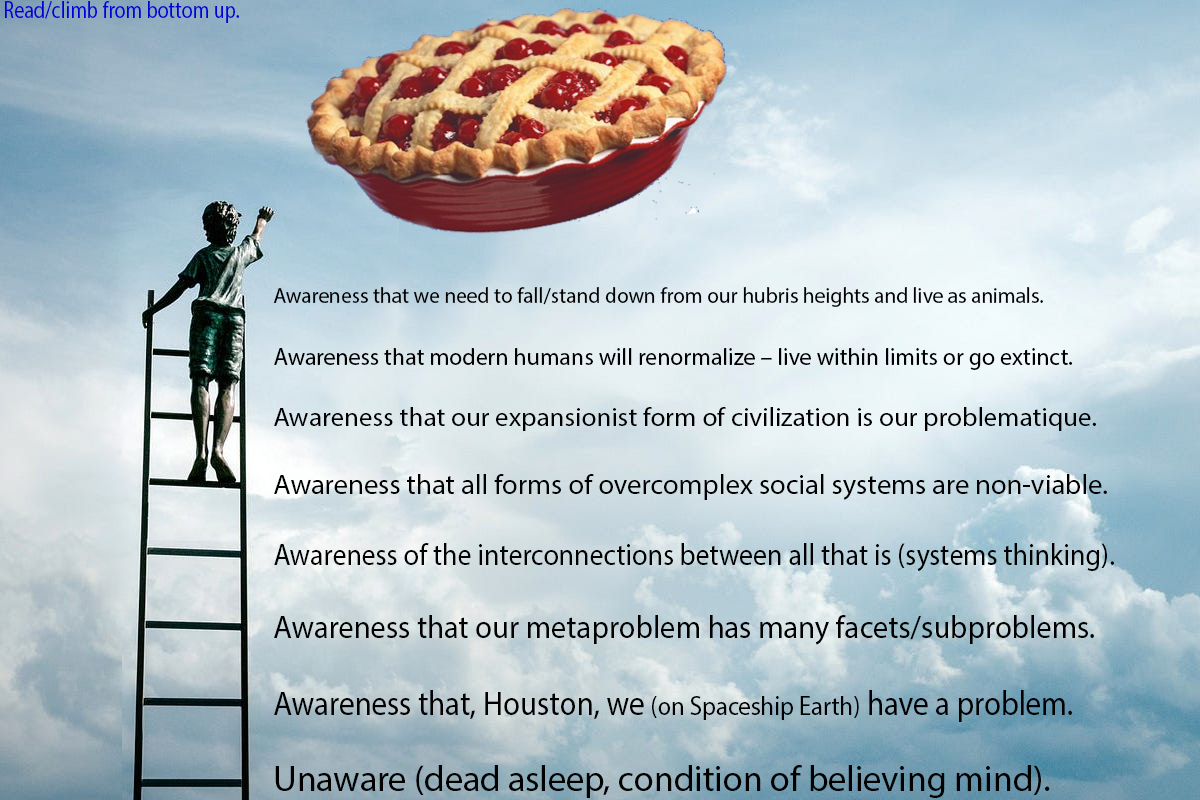 This ladder of awareness, inspired by Benjamin Casteillo and the insightful work of Bodhi Paul Chefurka, illustrates the progressive stages individuals undergo in their understanding of the modern techno-industrial expansionist form of civilization and its global unsustainability. It outlines the evolution of awareness of humanity's problematique, from initial unawareness to recognizing the interconnections between all that is and the difficulty of not underestimating the challenges of avoiding/mitigating a ghastly future.