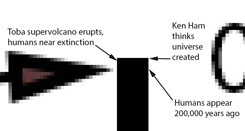 The first event there is room to show on this graph is the last event on the "Human Population Curve" graph, so together the two cover 5 billion years with a shameless focus on humans. The part of the line above the 200,000 year (0.2 mya) mark above, when modern humans have decided to call their ancestors "human," is three pixels high. The last pixel includes most of what is considered human history and prehistory worth noting.