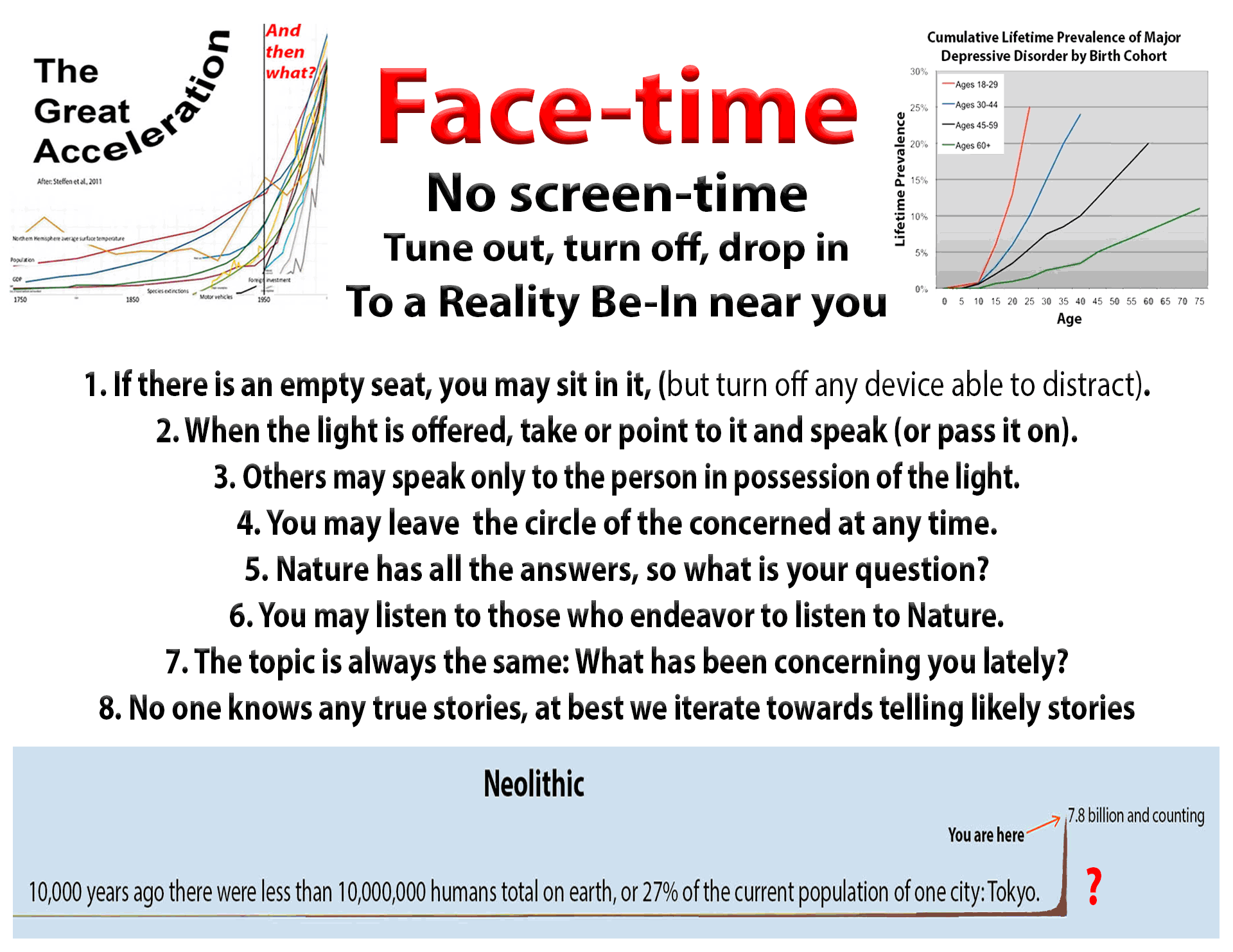 Face-time is like the Friendship Bench community intervention project for citizens with concerns, but without the bench. There are no formal leaders as all must seek to iterate towards a better condition, though individuals of merit, e.g. elders, especially grandmothers, should be present if possible. A foundational conjecture is that we moderns may be far too anthropocentric and self-centered than is good for us or the planetary life-support system. We empire-builders may need to stand down and listen to Mother.