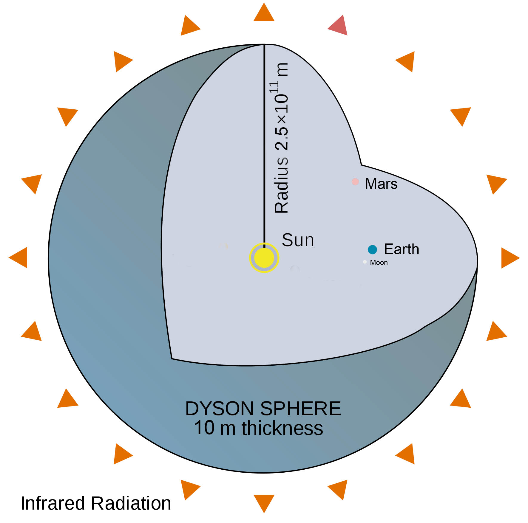 So the first array section is built by humans and their machines including robots using Earth resources. It is located at a distance from the sun of 250,000,000 km or 1.7 AU, between Mars and the asteroid belt. A Dyson sphere at this distance would have a surface area of 196,349,540,849,362,077 km2. Openings allow mining bots to transport material between inner and outer solar system.