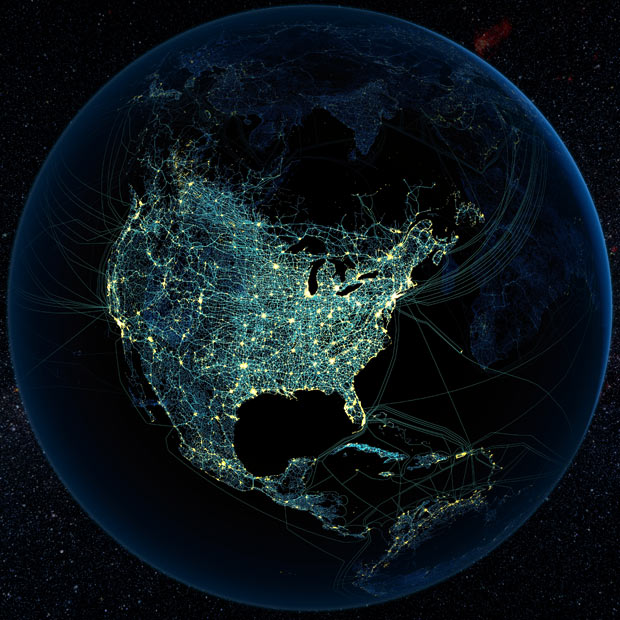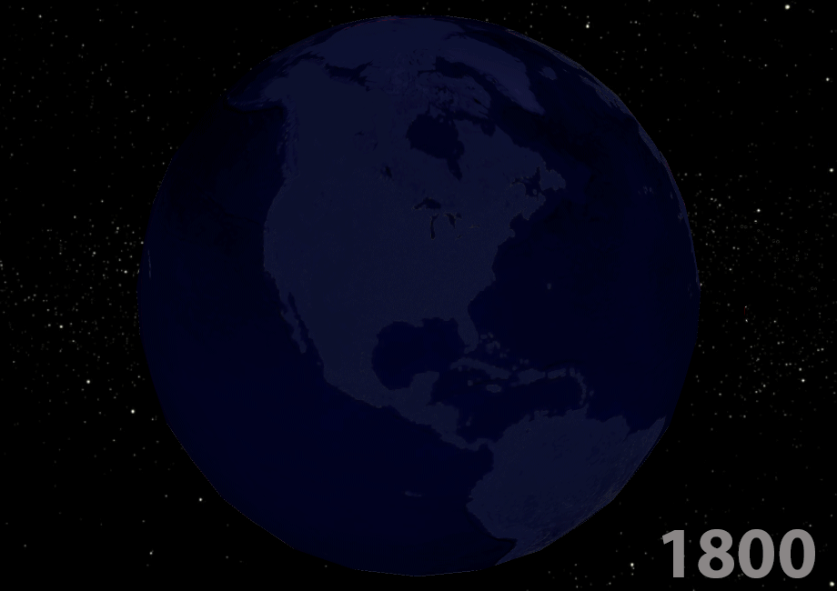 As a recent convert to Ecomodernism, I interpret the above animation to indicate that as we of the Anthropocene become evermore prosperous, amateur astronomy becomes so popular that the Dark-Sky Movement's demand that all have a right to view the night sky's heavenly wonders leads to a compromise: All human-scape areas where people want a well-lit life are domed. Roads between cities become tunnels, ask Elon Musk how. Areas outside of city domes will be restored to Nature. Envision honeycombed domes hundreds of meters thick containing the robotic control systems. The domes, small ones covering towns, vast ones covering cities, are each covered with soil and native vegetation where the deer and the buffalo again roam. A few hold-out Eloi may refuse to use fusion or clean nuclear power (or even clean coal) and cluster around hydroelectric sources because they don't believe in human exceptionalism nor value dark skies.