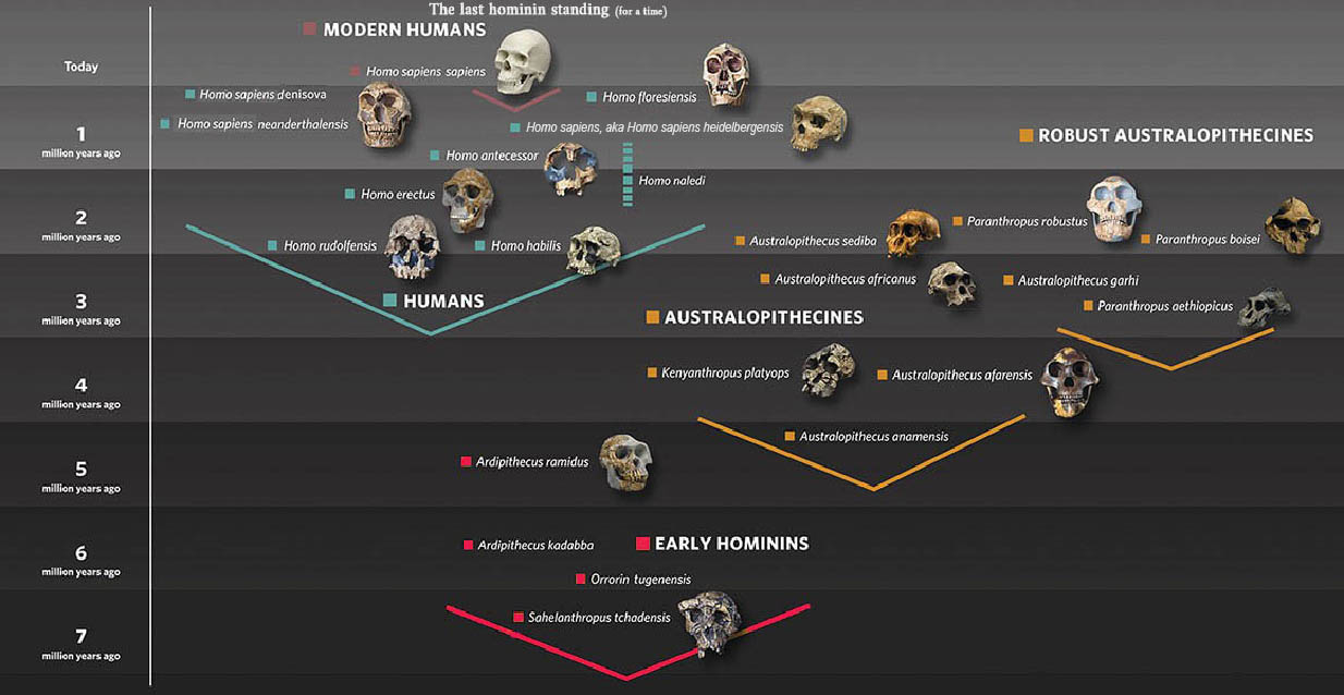 7,000 kya (thousand years ago) hominins evolve.