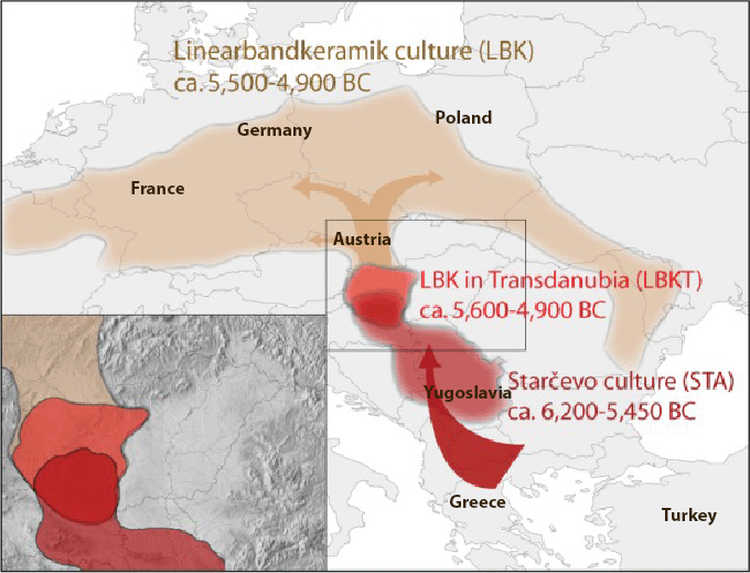The spread of LBK culture (Linearbandkeramik aka Linear Pottery culture) in central Europe of agrarians involved largely replacing the hunter-gathers who arrived in the region about 37k-42k years ago. There had been some interbreeding 40k years ago with the native Neanderthal population by the Man the Hunter expansionists, and similarly when the neolithic farmers spread over the region, less than 3% of their DNA was passed on to the Old Europeans (some hunter-gatherer infants/young children may have been adopted to survive to adulthood), indicating genocidal, in effect, replacement within farmable areas as an expansionist norm (the Man the Hunter expansionists replaced Neanderthal apart from about 3% of their DNA).