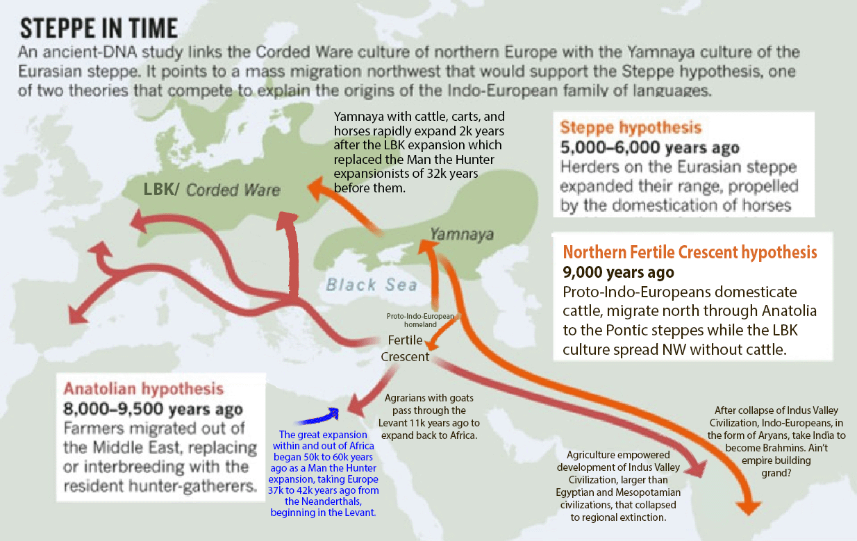 It is likely that Indo-European males on the leading edge of expansion were no obligate monogamists. This helps me to understand a report in the 1970s I found shocking, that half of male US college students in one study admitted they would rape a young woman if they knew they could get away with it. Among their recent paternal ancestors, 100% could and did what was expected and deemed normal. The challenge of renormalizing modern humans is not to underestimate. My guess is that only a matrifocal culture (K-culture norm) can renormalize humanity, i.e. tweaking modern techno-industrial society into its opposite is not possible. The change needed would be a paradigm-shift change.