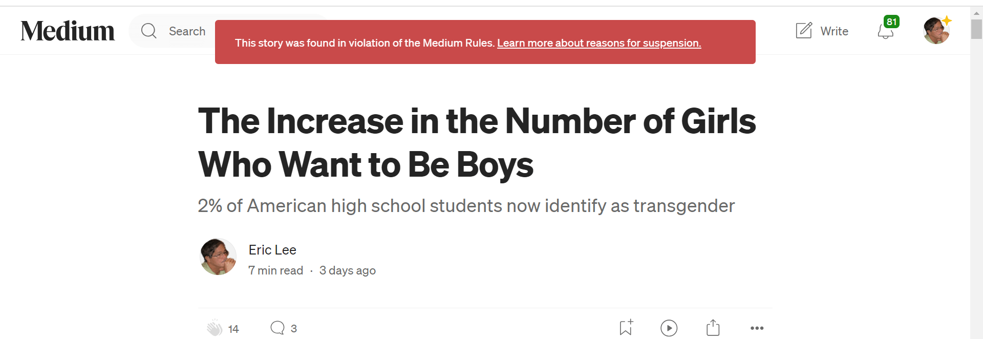 Medium is for-profit social media and there is no appeal to "We have determined that your post is in violation of our rules". Of the posted 797 missives, none are paywalled. I have 495 followers and 97 drafts are queued to post at a rate of one a day as I limit myself to perhaps not annoy. I can cancel the 97 and continue to add to the number of drafts without posting any. Or not bother and post content on this website with no visitors. The potential for constructive, critical feedback will be lost, but that's all.