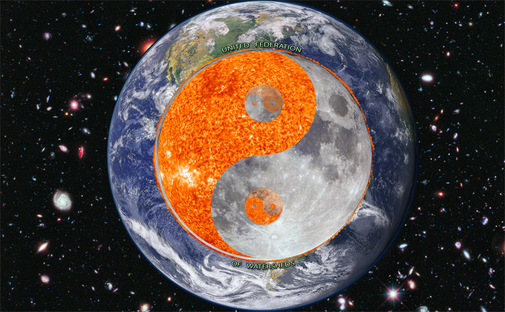 And matter encompasses energy, is a stable form of it, and energy moves matter, so within each is the other, it is systems of subsystems all the way down from Cosmos. The Federation (of the light footprint) is of the earth, so unnoticeable from a distance. The words UNITED FEDERATION OF WATERSHEDS occupies twenty percent of its circumstance as the Federation footprint is limited to twenty percent of land surface. If a Federation of Planets ever forms, they can go with a different flag/insignia design. The yin yang, humanities oldest coherent symbol for systems, was used by Neils Borg in his coat of arms, and by Technocracy Inc., the voice of natural laws as best as humans could understand them in the early twentieth century that hoped to help humans learn to live properly on the planet as Naturocracy Inc. may be able to do in the twenty-first century.