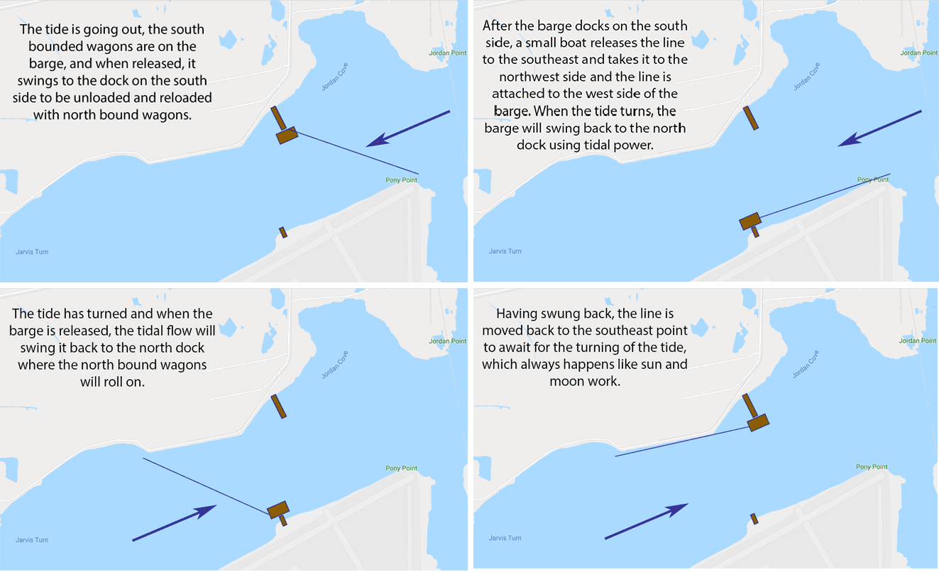Individuals walking or traveling by bicycle could be paddled across, but cargo transport involves high energy and wind power is intermittent. One solution would be to have the barge, which could be large enough to hold a dozen or more wagons and their teams of mules, attached to the other shore. When the tide is going out, releasing the barge would result in it swinging to the other side and docking. A boat would take the line and, going with the current, go across and attach it to the other side. In about six hours, the tide would have turned and releasing the barge, now unloaded and reloaded with north bound traffic, would swing to the other side when released. In another six hours it would swing back to the south side. So about every 13 hours, north bound wagons would cross, as would south bound traffic. The energetic cost would be in moving the line.