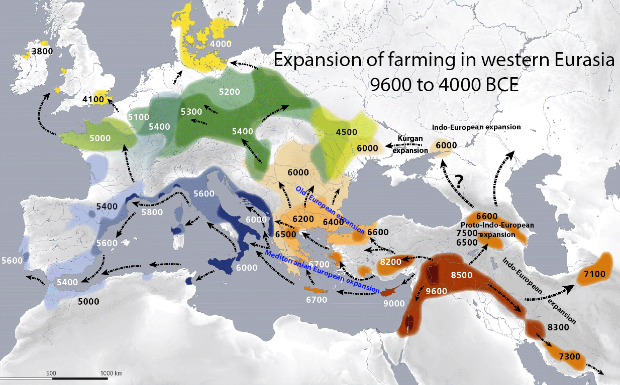 7000–2500 BCE (4,500 years, 9000-4500 BP): Anatolian Neolithic Farmers expansion as Early European Farmers into southern Europe prior to Indo-European expansion/replacement.