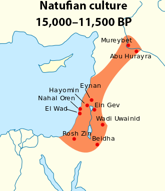 12,500–9500 BCE (3,000 years, 14,450–11,450 BP): Natufian culture was a Late Epipaleolithic archaeological culture of a hunter-gatherer form of civilization in the Levant that was displaced by agrarian pastoral cultures, a different form of civilization. They were preceded by the Kebaran culture (18,000 to 10,500 BCE) who used the bow and arrow, and had dogs, who were preceded by the Levantine Aurignacian culture (35,000-29,000 BP) who were preceded by the Emiran culture who were preceded by the Ahmarian culture (46,000–42,000 BP) who were preceded by the Boker Tachtit culture (50,000 BP) who as 'Man the Hunter' expansionists had come out of Africa to replace the Neanderthals (60,000 BP) in the area who had replaced the first Homo sapiens sapiens in the area (90,000 BP) who had replaced the Mousterians (160,000 to 40,000 BP) who evolved from Homo sapiens (heidelbergensis) from whose African branch H. sapiens sapiens evolved about 350,000 to 400,000 BP. H. s. heidelbergensis occupied the Levant 700,000 years ago after evolving from Homo erectus ergaster in Africa about 1.3 million years ago. H. s. heidelbergensis, on leaving Africa, displaced H. erectus, the first hominin in the Levant, who had come to the Levant about 2 million years ago.