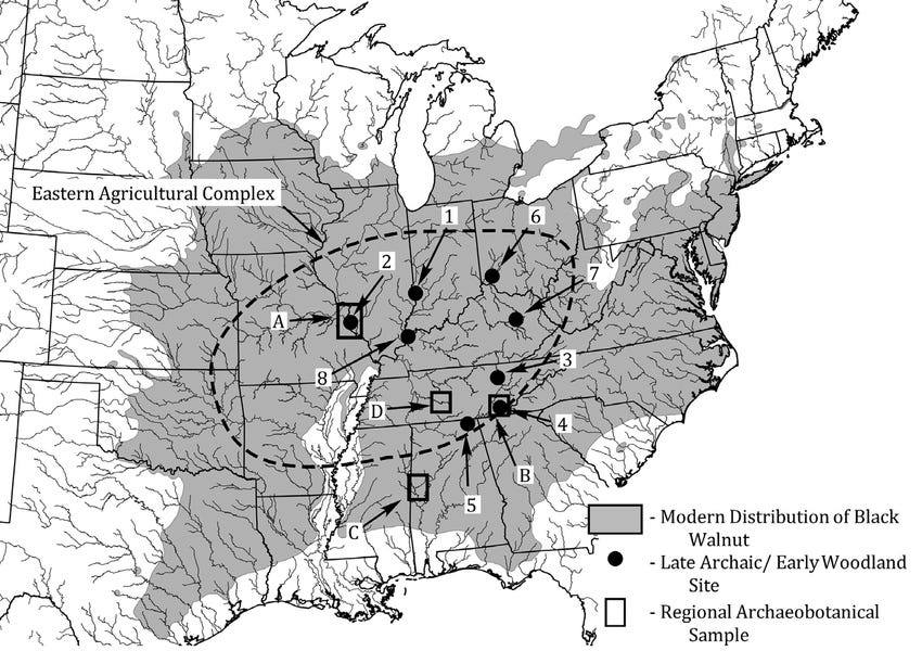 c. 5300-200 BCE (5100 years, 7250–2150 BP): Eastern Agricultural Complex (EAC) Amerind expansion. Plants domesticated by Indigenous peoples in eastern North America, primarily before 200 BCE. These crops include sunflower, squash, maygrass, lamb's quarters, sumpweed, and formed the basis of early agriculture in the region before the widespread adoption of maize, beans, and squash from Mesoamerica.