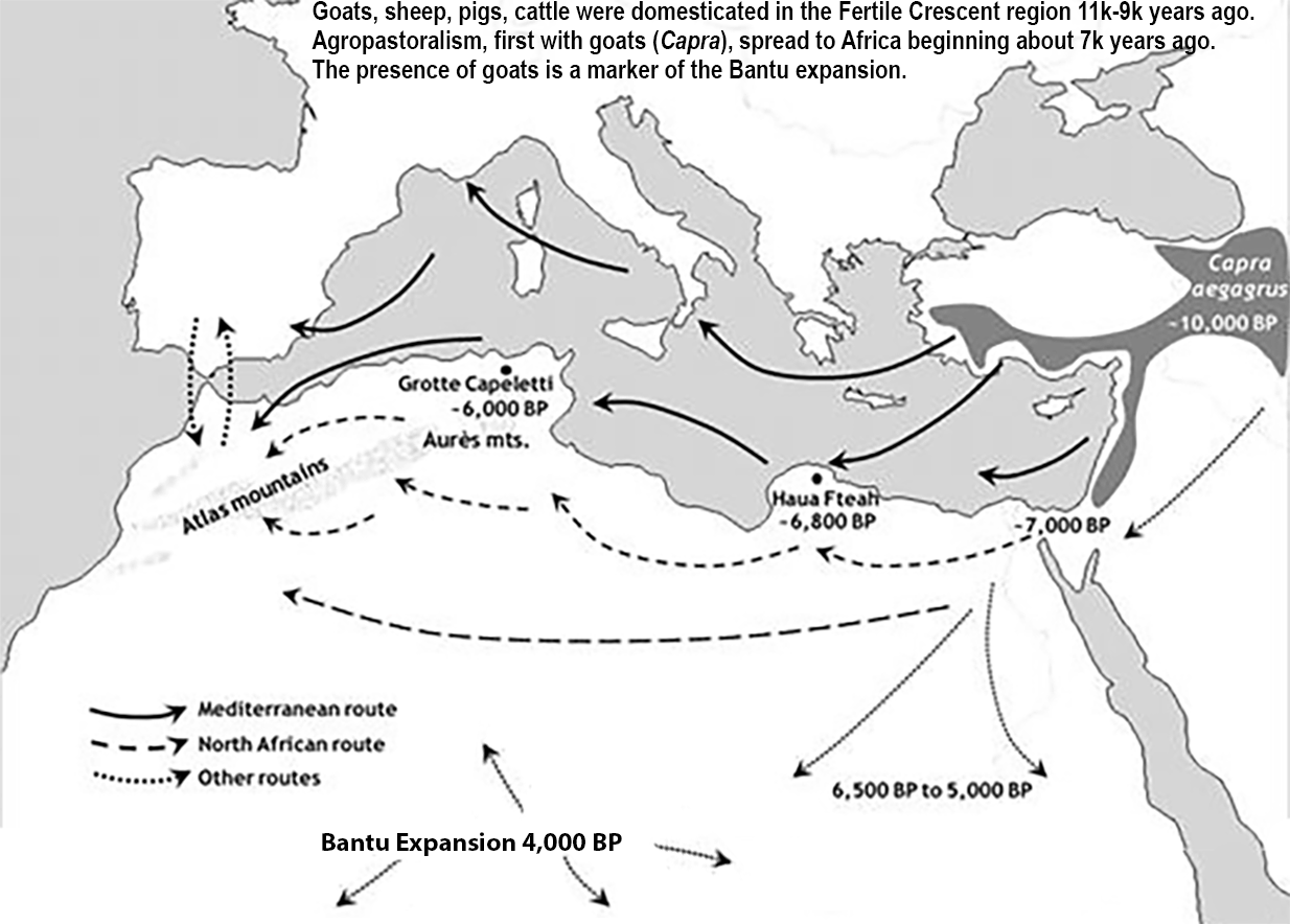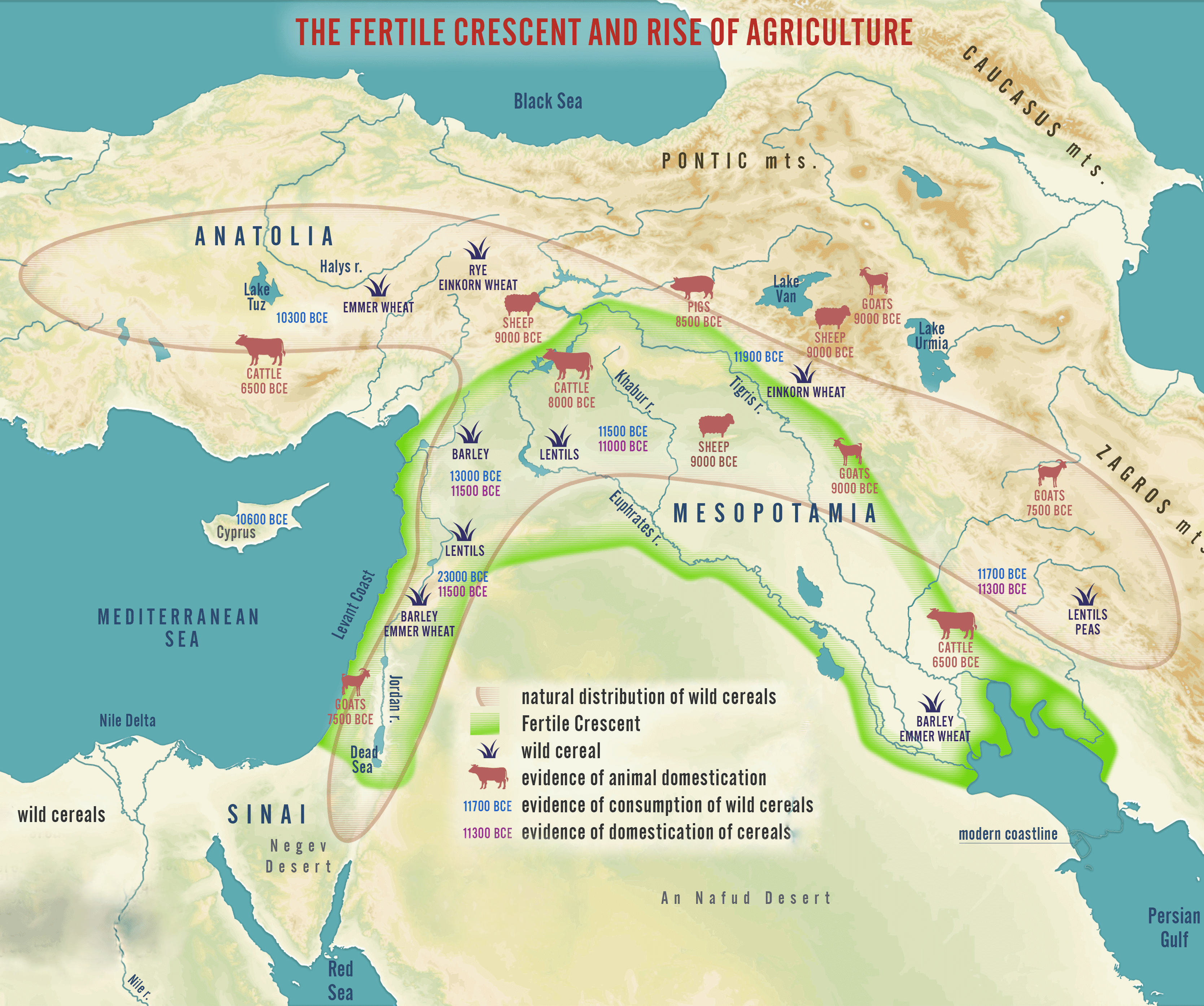 c. 10,000–7,500 BCE (2,500 years, 11,950-9450 BP: Fertile Crescent agricultural/agropastoral expansion based on crop domestication and then animal domestication with increasing population and labor intensity (of commoners/serfs/slaves/elites in population centers/empires)