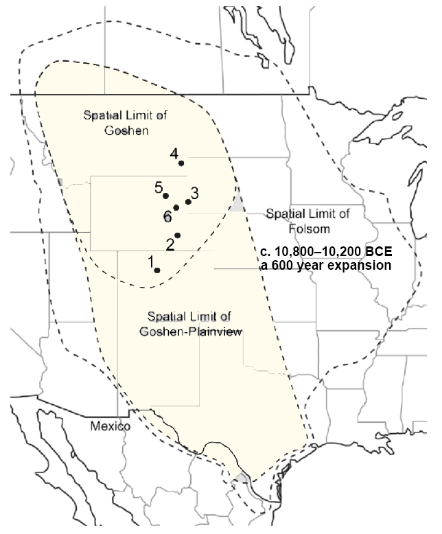 10,800–10,200 BCE (600 years, 12,750–12,150 BP): Folsom culture followed the Clovis culture and loss (extinction) of megafauna larger than bison. The Folsom point was therefore smaller. Scarcity of easy to kill megafauna, competition, conflict led to a new point, the Plano point, good for killing humans.