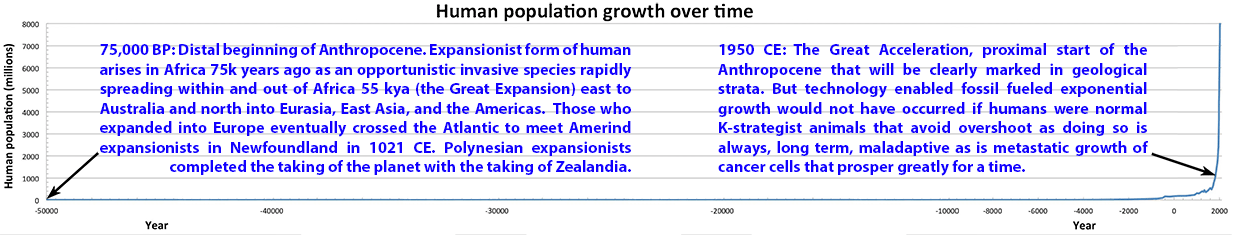 Oh, but if initially 1% of bands view the animals as a resource for the taking, take them, prosper, and easily support large families. And their offspring do likewise only more efficiently and with greater enthusiasm. Soon, all who are expanding out of Africa are enthusiastic expansionists whose r-culture (short-term quantity maximizer culture) celebrates taking. As one area is depopulated of fauna, no problem, they move on. This short-term expansionism as an invasive species was evidently selected for.