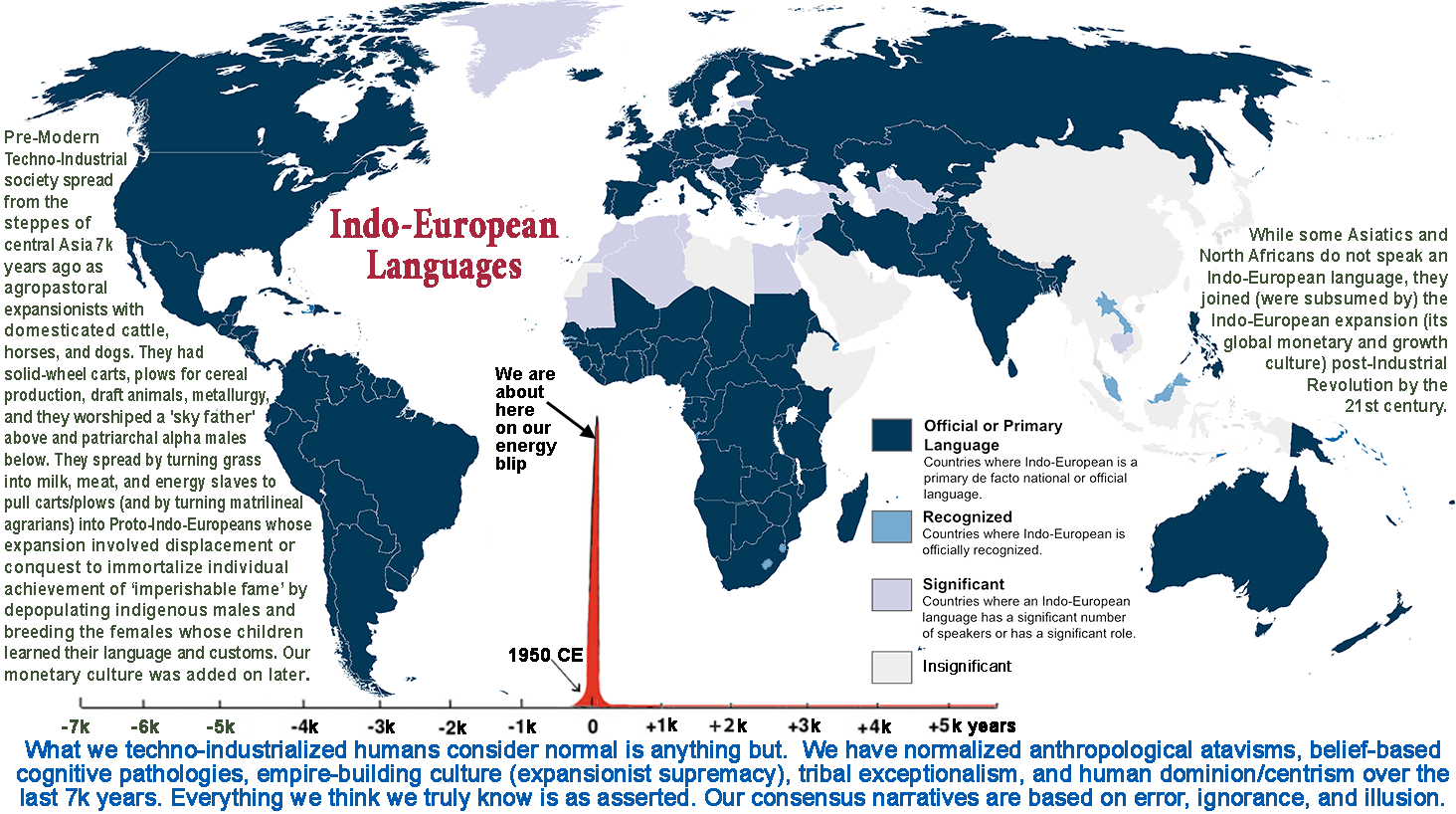 1712 CE: (238 BP): Industrial Revolution begins with first commercial steam engine used to pump water from coal mines. The fossil-fueled belief-in-growth based Euro-Sino Empire emerges to subsume/assimilate all prior empire builders into a global monetary techno-industrial culture.