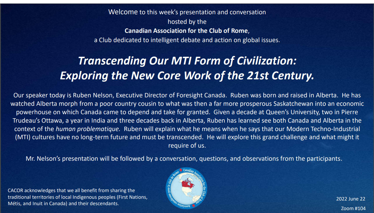 COOS BAY (A-P) — Ruben Nelson's presentation to the Canadian Club of Rome members and such as may have learned about it before June 22, 2022 (thirty some attending a Zoom meeting), may be too few to start a revolution. Revolutionary change (e.g. transcending our MTI form of civilization) always comes from the few to whom it initially seems they may be the only one (and one always is), but eventually (if they are not the only one, e.g. Ted Kaczynski) they may learn of others having similar concerns and recognition (understanding) of the need for foundational change (as distinct from ideologues who believe that change would be like so needed, the best thing ever by telling potential followers what they want to hear, a fault Ruben seems incapable of). Understanding, based on a lifetime of inquiry and endeavor to envision and foresee, gives raise to a choiceless awareness of conditions past, present, and probable future that compel existential concerns, a need to understand the rules of the game and endeavor to play it well enough to persist (not as an individual subsystem of a species/biosphere, but as embodied in posterity as they who may live properly with the planetary life-support system and thereby persist as evolvable subsystems).
