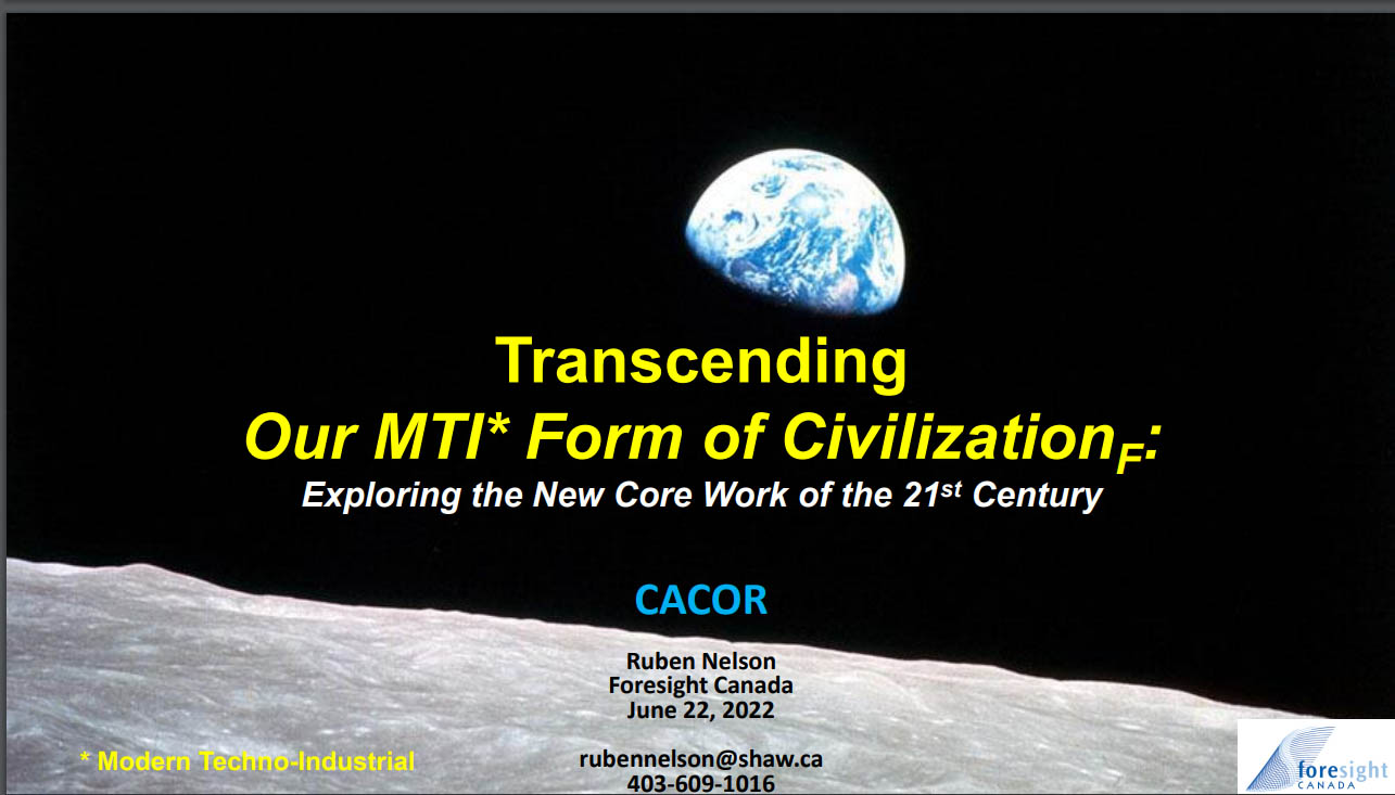 Thank you Ted, and thank you to all who are on this call. I look forward to engaging with you later, and I also want to thank all who watch it, without an opportunity to engage, watch it on YouTube, so I put the URL for CACOR there and hope that many of you will connect with CACOR and become involved. I want to think with you about transcending our MTI forum civilization, and I hope by the time I'm finished, you'll understand what I mean and intend by that phrase.