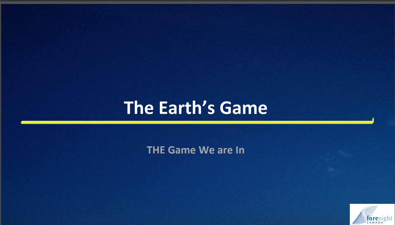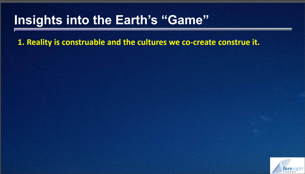The earth sets the conditions, offers clues about the game, there are no clear instructions, and it's the referee as to when you get thrown out of the game. And it appears that you must not destroy the earth's living ecology to the point it can no longer support us; that we must not consume non-renewable resources to the point where diminishing returns become lethal and we must honor these first two conditions and be humane enough with each other to keep the game going.