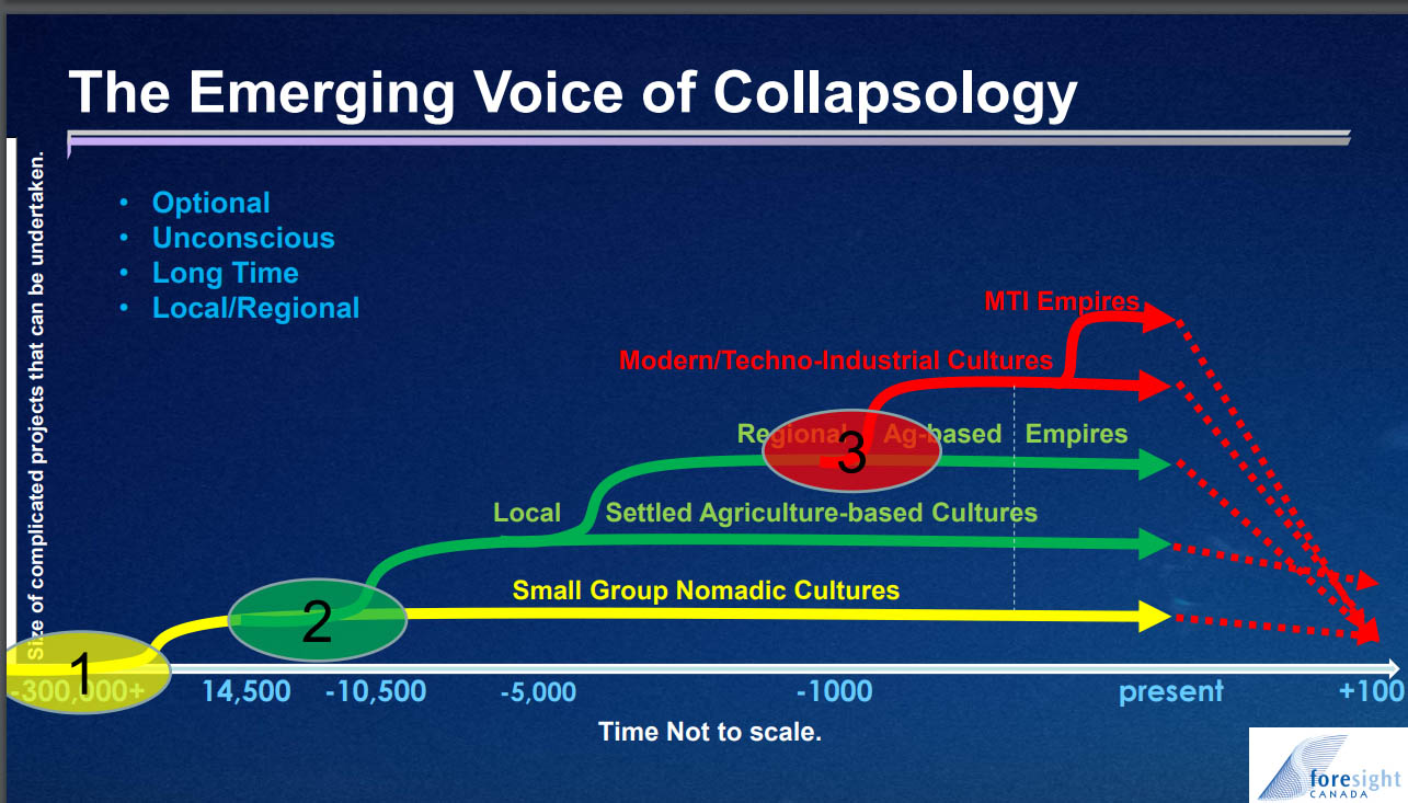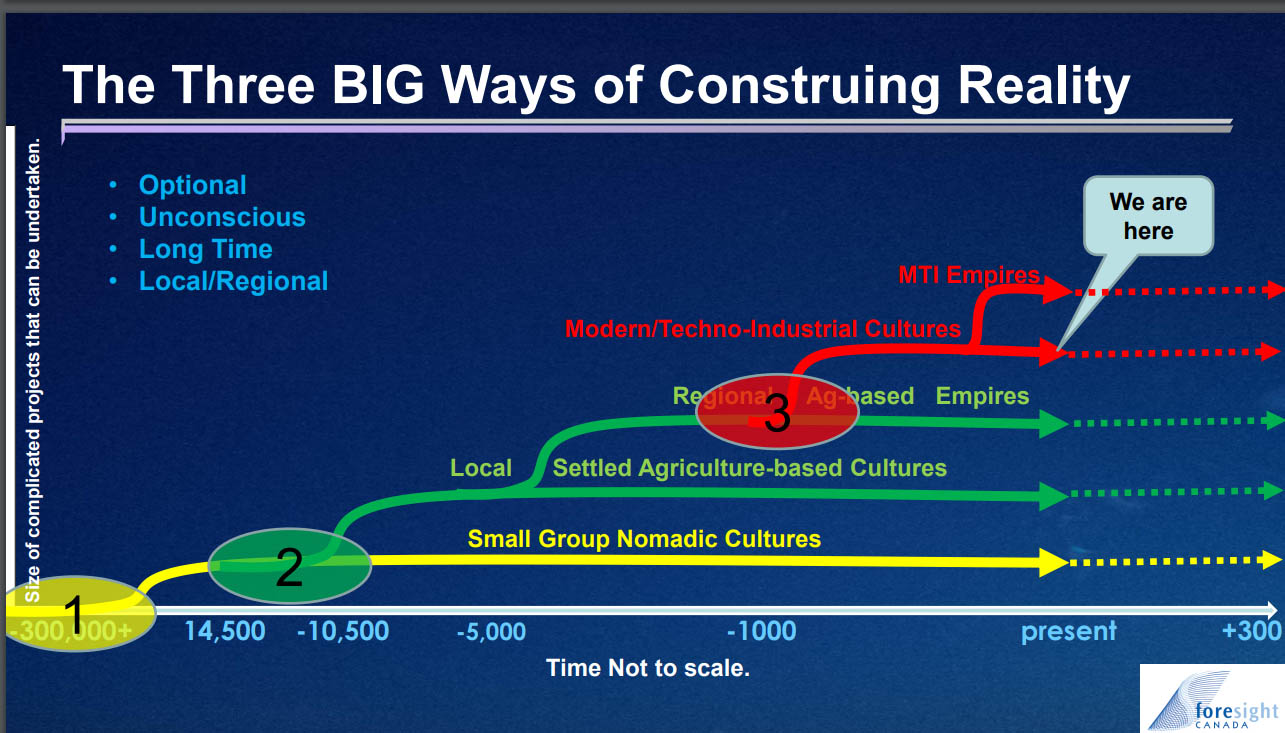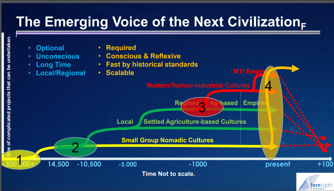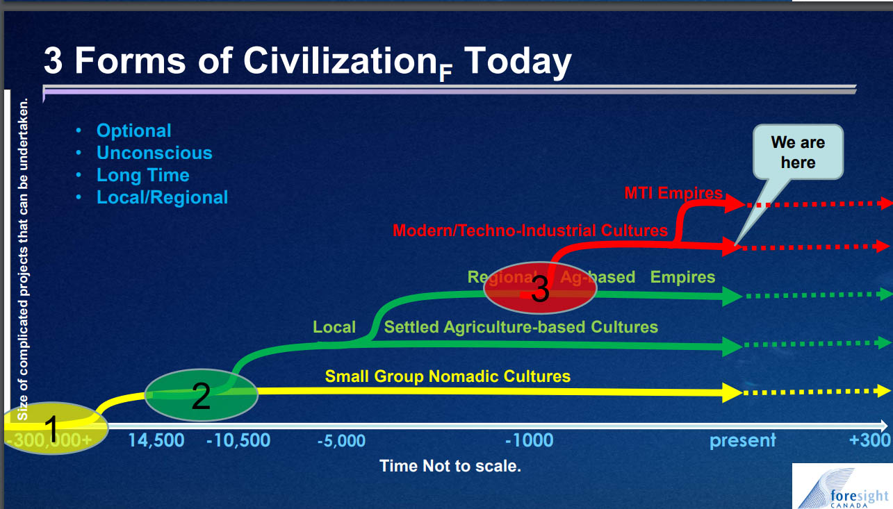 Every culture was an exemplar of small group nomadic cultures, and then, with Holocene agriculture became possible. It was optional, wasn't required, and so eventually local settled agriculture-based cultures emerged. And then in the last thousand years we have developed our modern techno-industrial cultures. And that we are here is, for Canadians, because nobody talks about a Canadian Empire, the last two forms of civilization, empires can emerge.