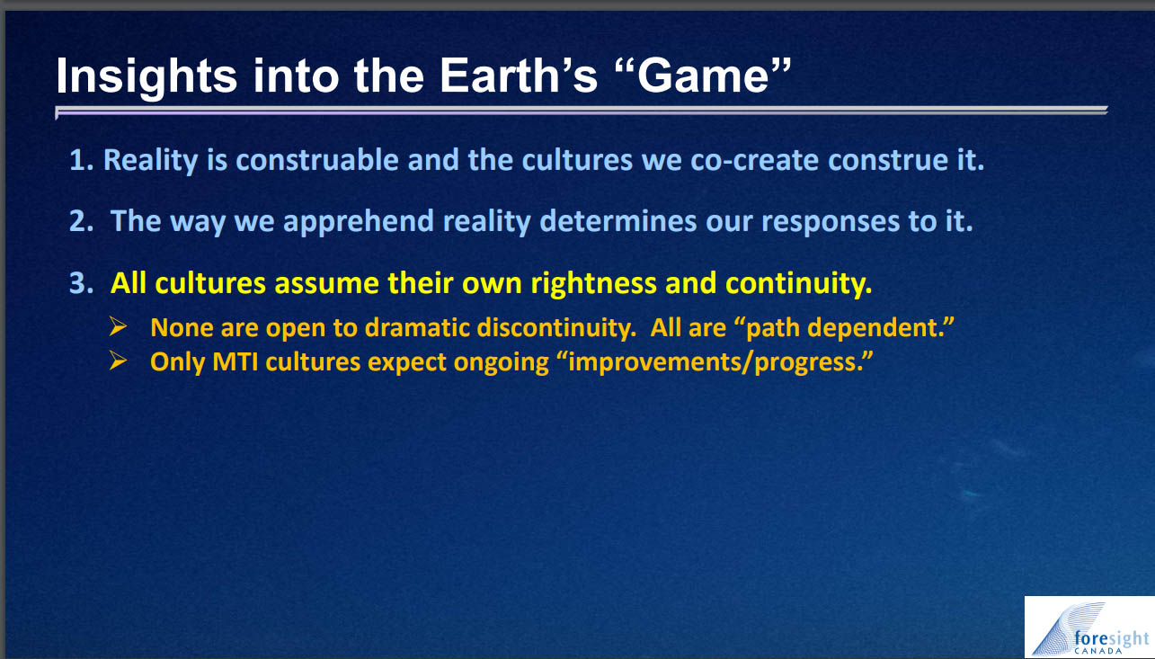 All cultures assume their own rightness and continuity. None are open to dramatic discontinuity. All are path-dependent, and only MTI cultures expect ongoing "improvements" in progress.