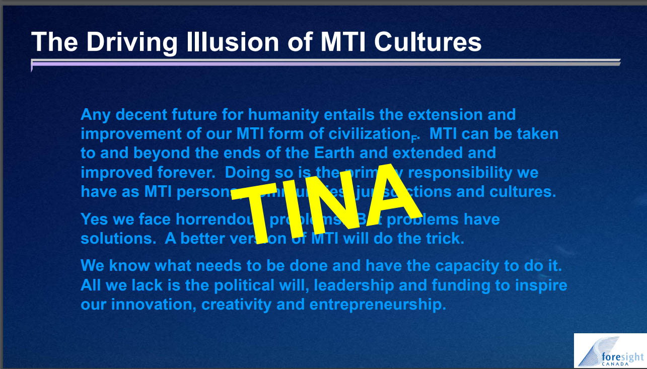 Our modern techno-industrial ways of knowing, seeing, thinking things through, and living (and I'll just remind you that you'll see that phrase and that color coding again and again, I will explain it later) as of today we who are MTI peoples are not seeking to transcend or escape from our MTI form of civilization. Rather we seek to improve and extend the life of MTI cultures by making them to be global, equitable, and sustainable... and one example is the UN's Sustainable Development Goals, and I know it sounds heartless to say, but surely you can't mean that helping other people have a life that's at all akin to a decent life is evil, and I'm not suggesting it's evil. I'm just suggesting it's wrong-headed because it's still within the illusion that this earth can sustain eight billion people, or whatever your favorite number is, as modern techno-industrial people.