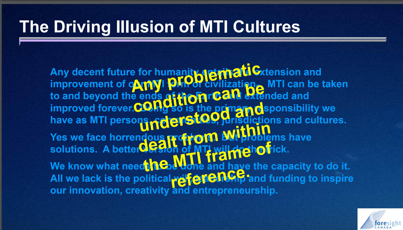 so that the MTI cultures are hooked on the thought that any problematic condition can be understood and dealt with from within the MTI frame of reference, and that raises the question of what is that frame, and by the time we're finished, I will have explained that as I understand it.