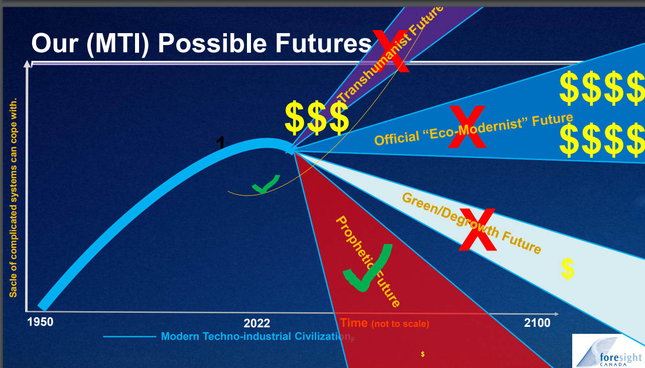 So, I'm suggesting that there are only five possible futures, lots of variations of them, and the dollar signs indicate where we're actually putting our bets and our money as a culture and so most of it of course is to continue our MTI cultures in some kind of eco-modernist way. And all that means is that we believe in ourselves, we believe what we've done, we think that science and technology is the clue to everything, with, you add a couple of economists on the side, and give it lots and lots and lots of money. So it's STEM times M is the formula, and the fork that M is money.