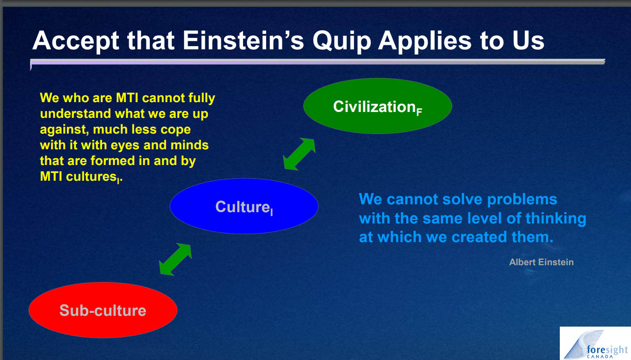 His quip was, we can't solve problems at the same level of thinking that created them, and I'm suggesting that we who are modern have to take that seriously and understand it. That we who are MTI cannot even fully understand what we're up against, much less cope with it, as long as we're working with the eyes and minds and habits that are formed in and by MTI cultures. So that the implication of a new level of thinking is actually a new form of civilization.