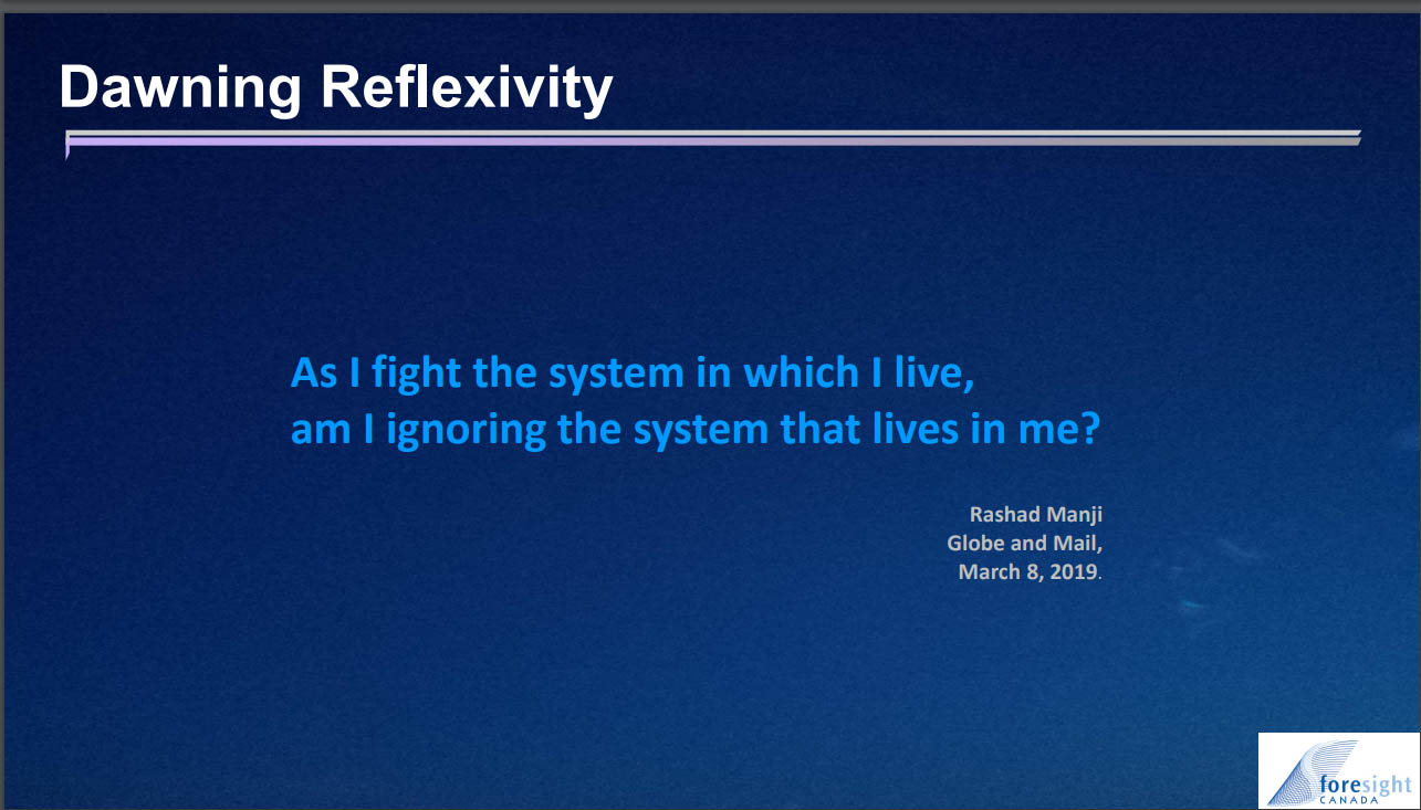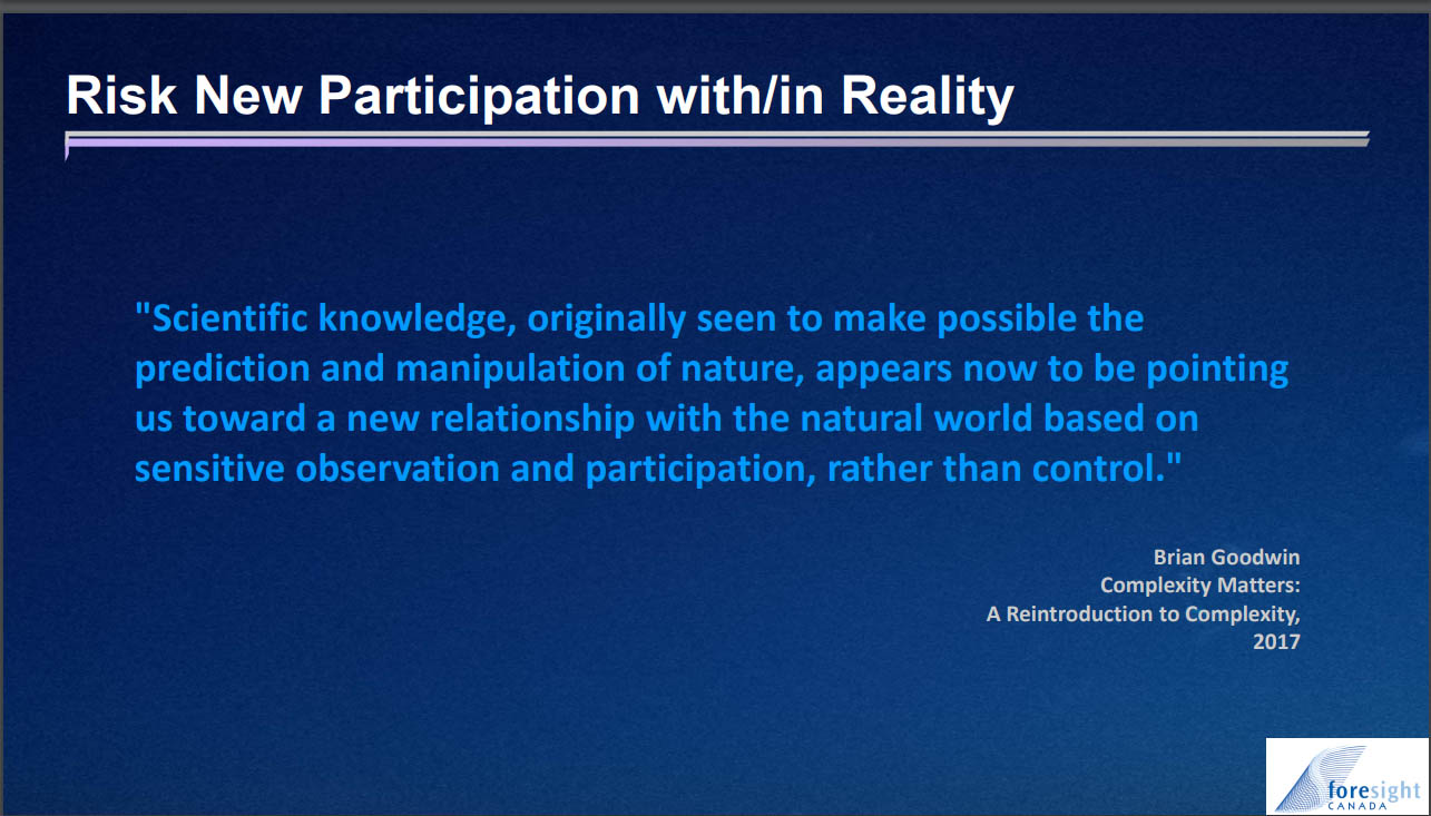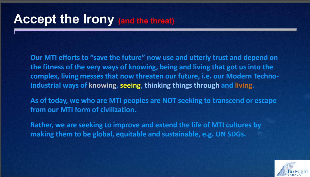 And we have to accept the irony there's a threat in it as well, that virtually all the MTI efforts to save the future, and you know that that's now a multi-billion dollar global industry, now use and utterly trust, and depend on the fitness of the very ways of knowing, being and living that got us into the complex living messes that now threaten our future.