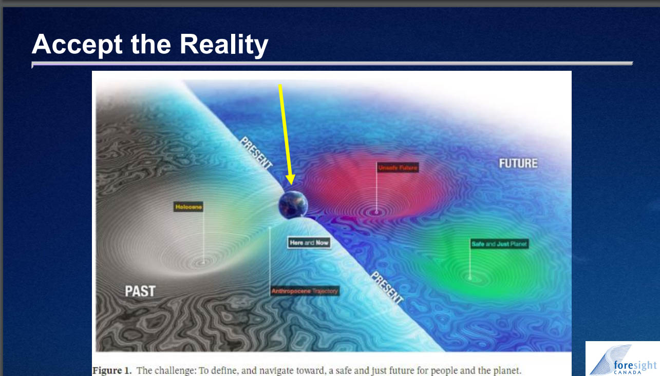 This image comes from our friends who do complexity theory and it's simply reminding us that our modern techno-industrial way of life is spinning the earth out of the basin of attraction which has been the Holocene. It's the basin we've been in for 11,000 years with a climate that's very conducive to us, and millions of other species. Now, the modern and techno-industrial world believes we're still in the Holocene and will be there forever. Well, in other words, they think this is fake news.