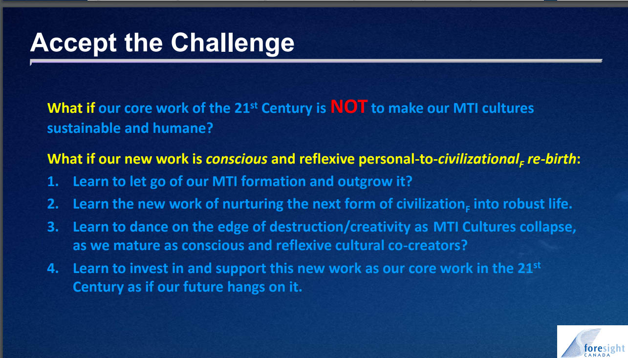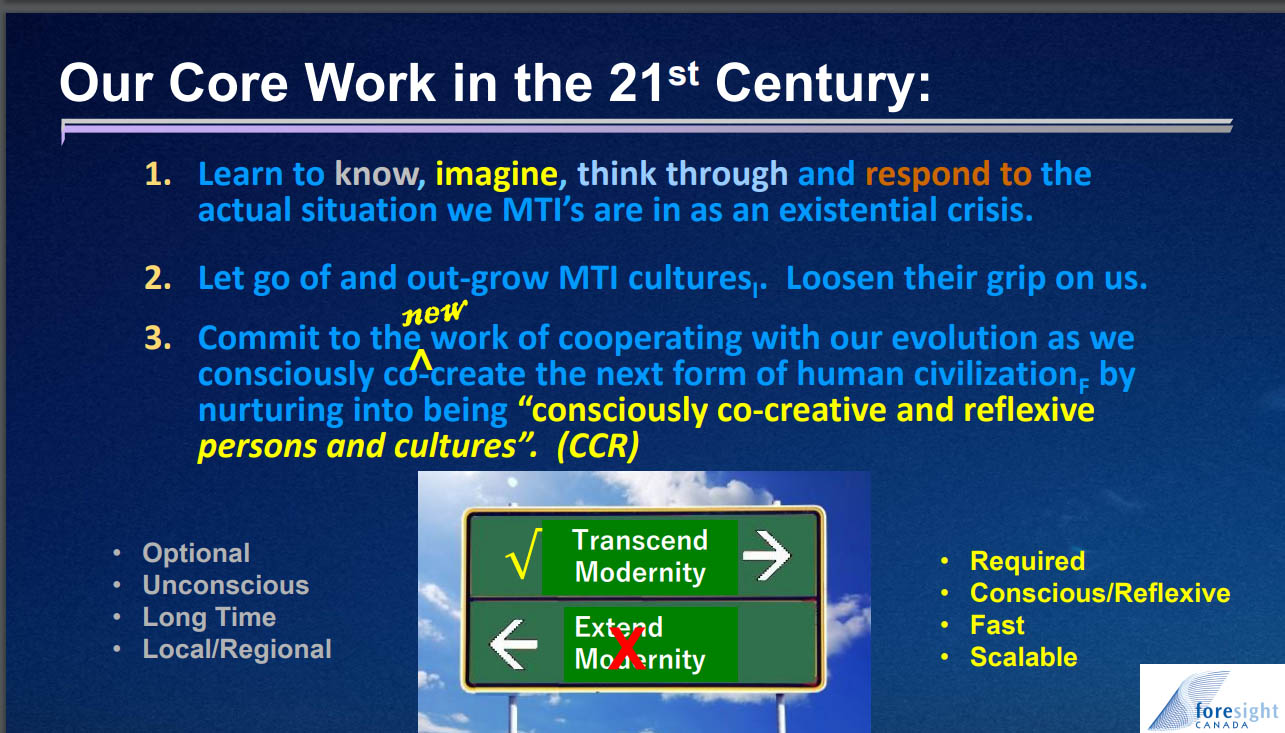 So the core work of the 21st century, I'm arguing, is literally to learn to know and imagine and think through and respond to the actual situation that we're in, and that is that our form of civilization has no long-term future, and that therefore, to consciously become consciously co-creative, and reflexive persons and cultures, so we're replacing MTI with CCR, so says he as if he knows what he's talking about. Thank you, and over to you.