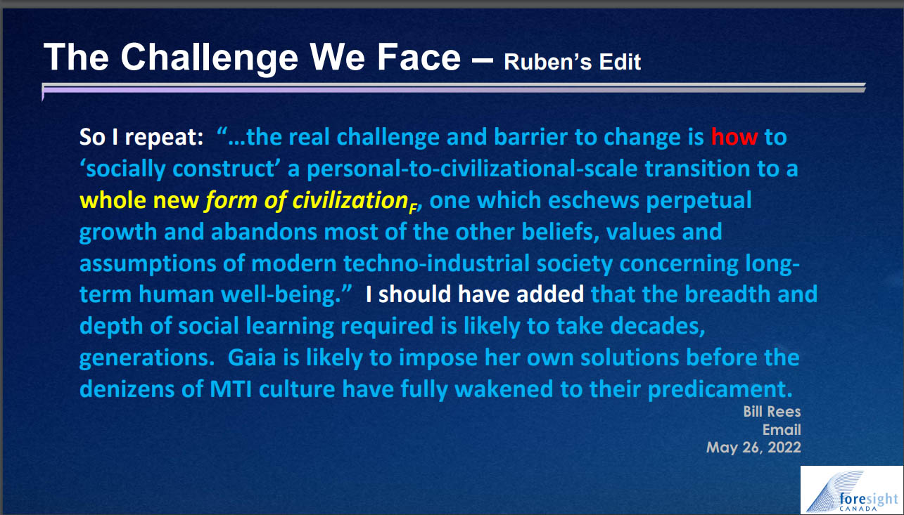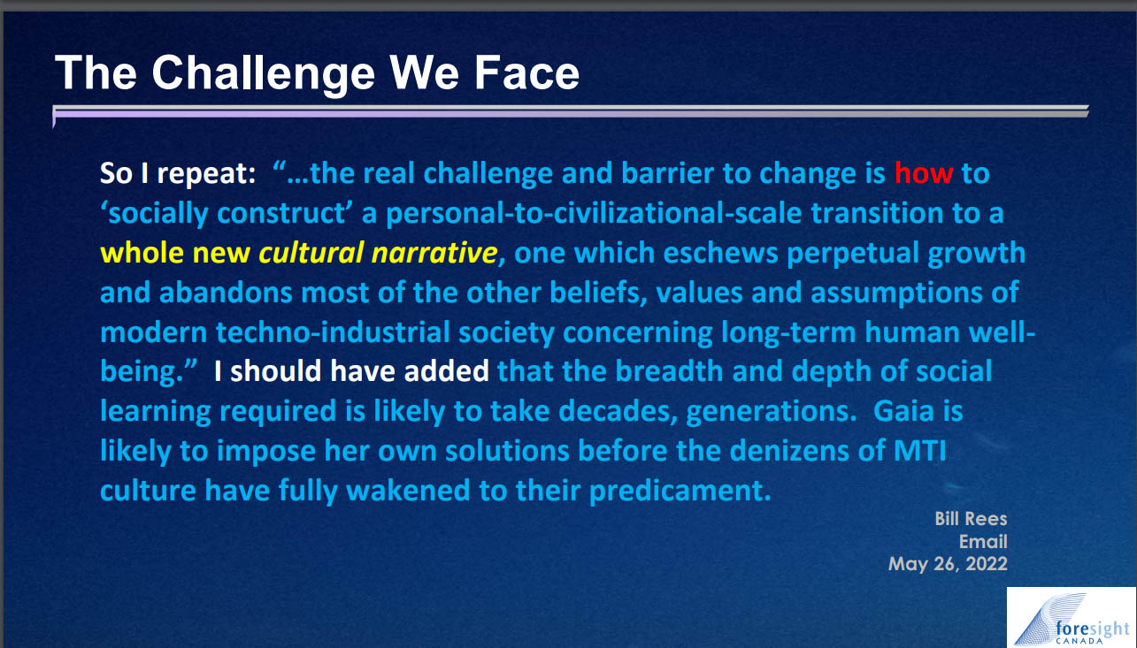 And here we come to Bill Rees. I promised we would get to him, eventually. Bill, this is from an email that was part of a listserv I'm on less than a month ago, in which he said, so I repeat, the real challenge and barrier to change is how to socially construct a personal to civilizational scale transition to a whole new cultural narrative, one which excuse perpetual growth and abandons most of the other beliefs, values, and assumptions of modern techno-industrial society concerning the long-term human well-being. I should have added that the breadth and depth of social learning required is likely to take decades, generations.