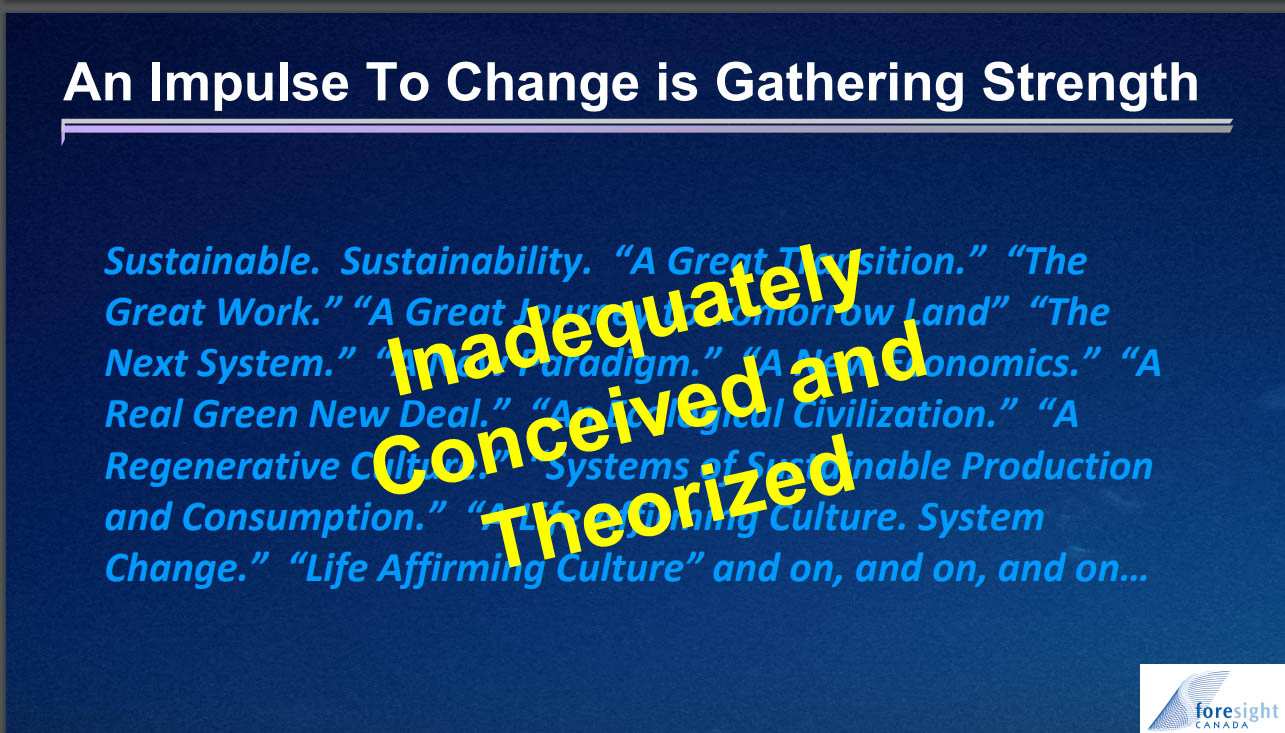 I'm thankful for that, but in my view it is inadequately conceived and theorized at this point of its development, and this includes the multi-billion dollar sustainability industry, the folks who talk about a great transition, the great work, on and on, and on. System change, not climate change, a life-affirming culture,