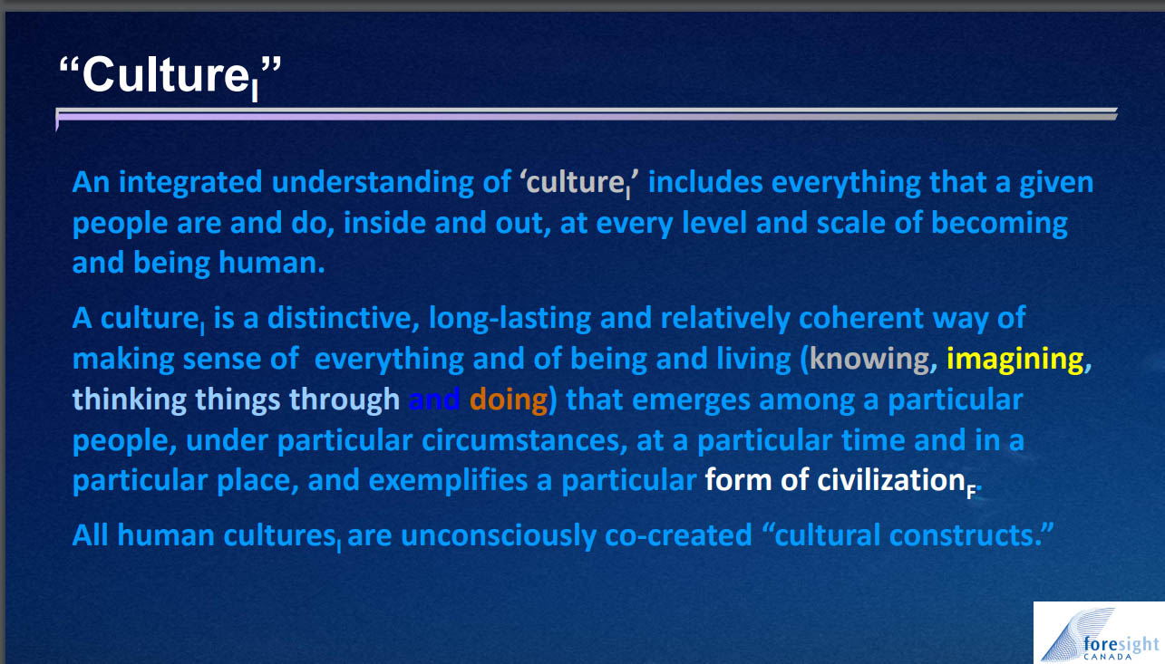 You don't have to agree with me, but I want to define an entity that is... I use 'culture' subscript 'I' because that's an integral use of the word culture. When you have an integral understanding of anything it means that all the things that it are, nothing is left out. There's no externalities. Everything is included and so I want an understanding of culture that is integral in that sense or includes everything that a given people are and do both inside and out at every level and scale of becoming and being human.
