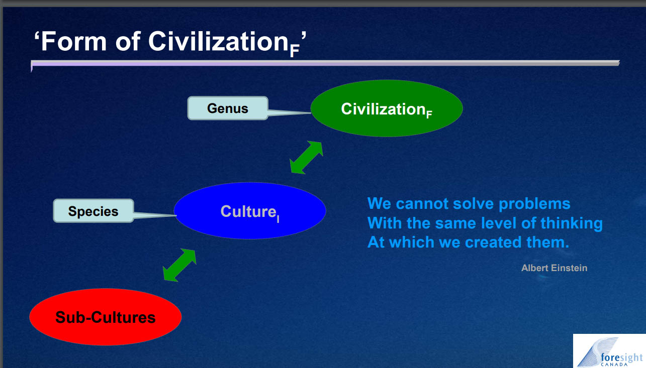 All human cultures are unconsciously co-created cultural constructs, so that's what I mean if I'm talking about a culture that exemplifies a form of civilization. So here at last is an understanding of 'form of civilization'. It's at a higher level of generality than a culture, in the same way that fruit is at a higher level of generality than apple, or vegetable is a higher level of generality than potato.