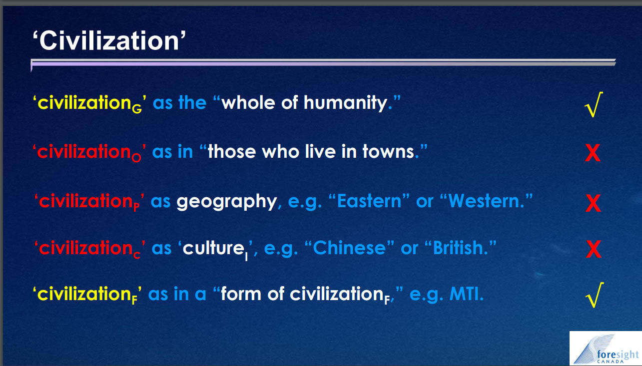 I just very want to quickly either affirm them or get them out of the way. The one I affirm is civilization subscript 'g' for global as in the sentence 'human civilization is at risk', meaning the whole of humanity is at risk. Perfectly useful way to use the word 'civilization'.