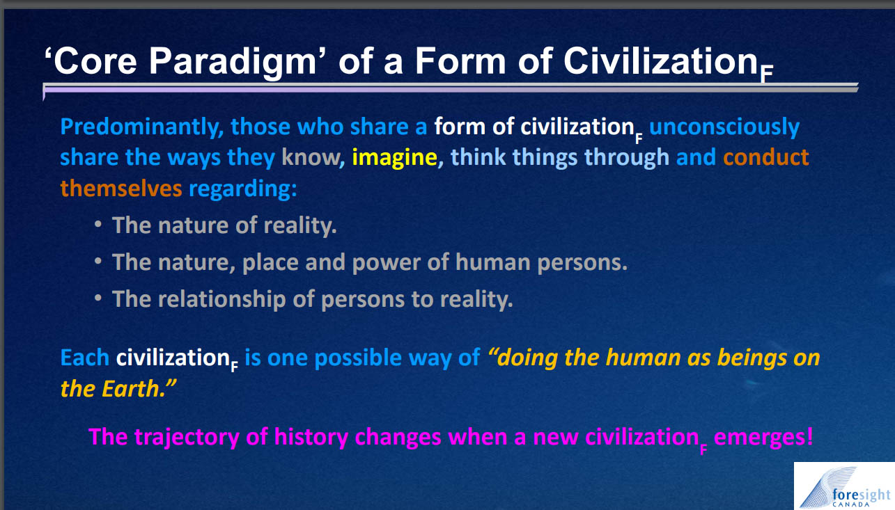 And the core paradigm are the critical insights into the nature of reality, the nature place and power of human persons, and the relationship of human persons to reality. And remember the content of those three things would be affected by and limited by and shaped by the ontological and epistemological framework of the form of civilization.