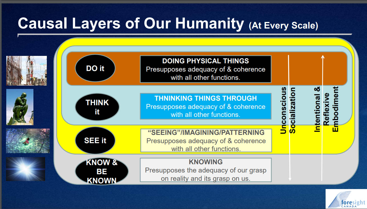 You can have as many layers as you want, and whatever model you decide to have, but it does mean that the model, that the layers, are causally related to each other. So if you change something significantly at one of the layers, it will eventually leak out and make changes in the other, because any consciousness or culture has to be reasonably coherent. There has to be some line of sight between whatever the four layers are. These are the four layers in the causal layered synthesis that I've developed over my lifetime.