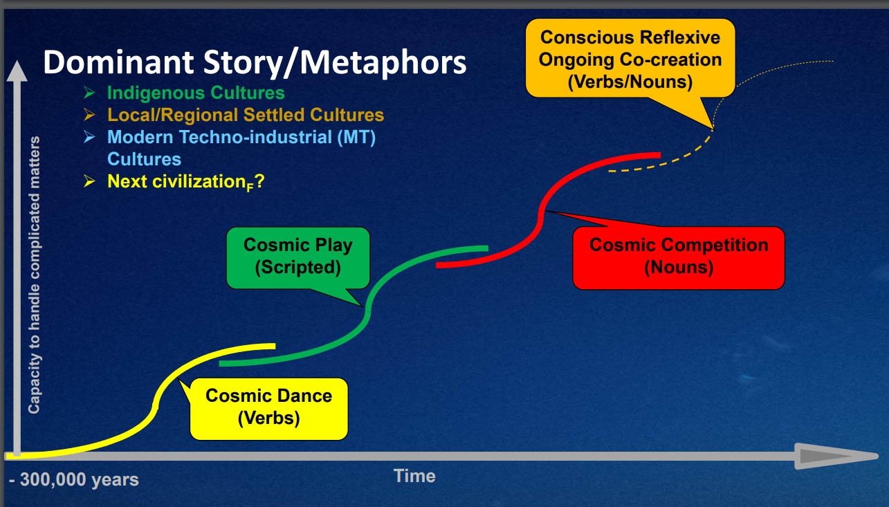 In the modern world we're in a cosmic competition. not an accident that most modern languages are noun based, certainly English is because you win in modernity by having the most stuff, again bias to the hard data. And the next form of civilization of conscious reflexivity will be one of ongoing co-creation, and so it will use nouns and verbs, but it will use them intentionally and consciously.