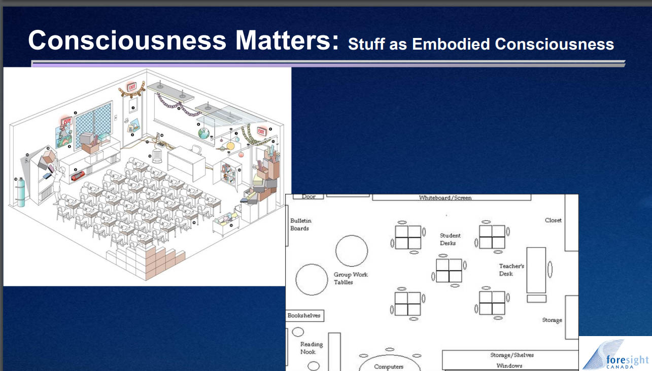 So here's a picture of two classrooms and if I ask you which is older than the other, you know immediately which one is older. If I ask you to write even a short paragraph to answer the question 'how many people are needed in each of those classrooms for a student to learn?' The interesting thing is you can answer that question simply by looking at the physical arrangements. If I ask you to think about in which uh classroom are you likely to more easily be given permission to stand up and walk around if your back is stiff and you just need to stretch it, as opposed to seek permission from the teacher to get out of your seat. How does the role of the teacher differ in each classroom?