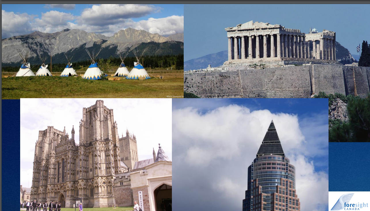 Here are four buildings on a landscape using my model. These are hard things, but they reflect a consciousness that says, given our consciousness and the metaphors that we use, and the way we think about it and express that consciousness and stuff that these are appropriate buildings to build on the landscape given who we think we are and what this earth is.