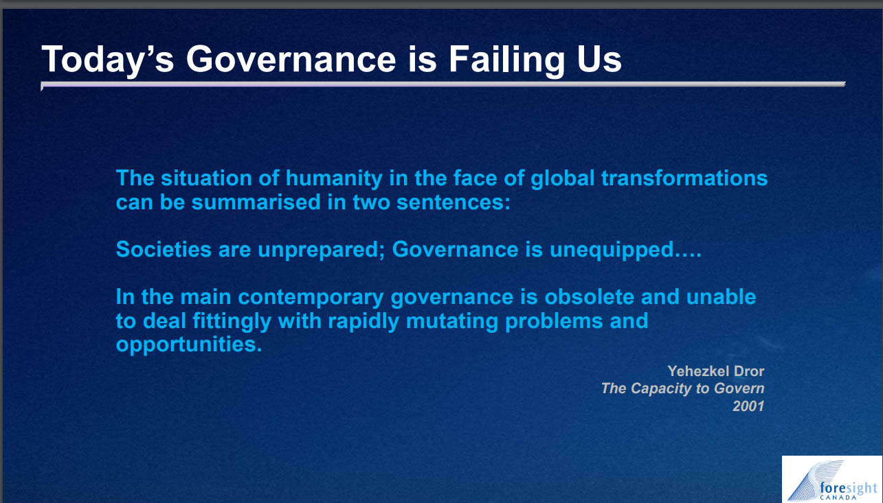 As Yehezkel Dror said 21 years ago, the situation of humanity in the face of global transformations can be summed in two sentences. "Societies are unprepared. Governance is unequipped." In the main, contemporary governance is obsolete and enable the field to deal fittingly with rapidly mutating problems and opportunities.