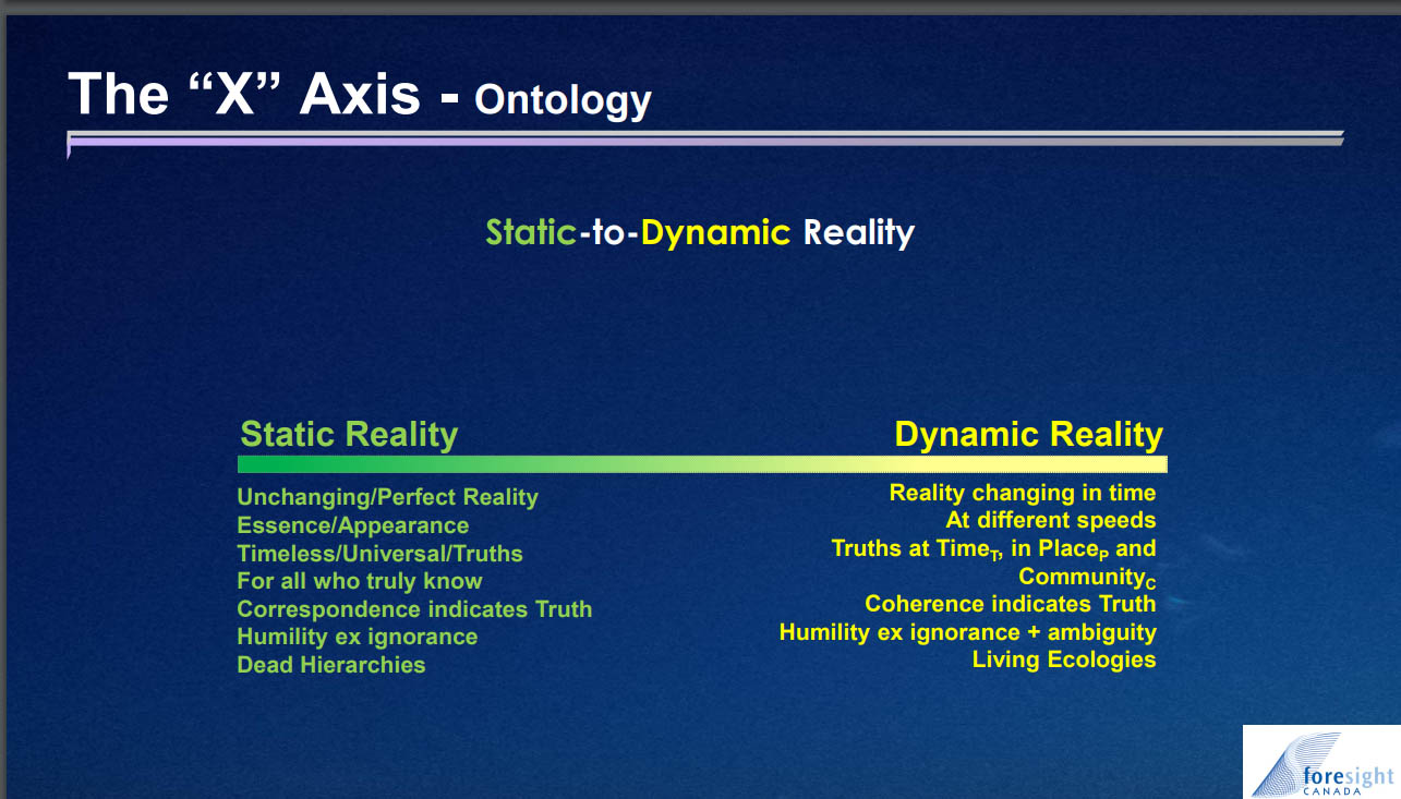 and so this is just a simple two by two matrix. The x-axis is ontological. It's about the nature of reality, and on the left-hand side you were the Aristotle, that reality is static, that the really, real does not change now things appear to change, so that's why you need, in a culture that's at this end, the distinction between appearance and reality. It's why reality can be perfect. So here, in principle, knowledge could be perfect and if your knowledge is less than perfect, it's simply out of ignorance in the sense that there's too much to know and you don't know it all yet, or you've made a mistake in observing reality, but in principle knowing can be perfect.