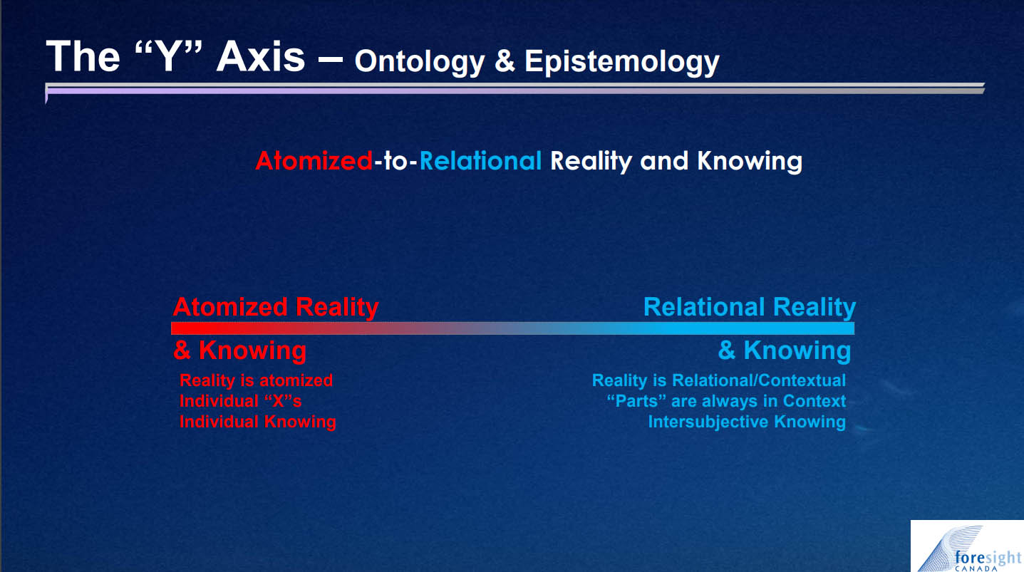 The y-axis at the left-hand end you have atomized reality. That is, you're dealing with a thing that can be broken down into its constituent parts, and you can then break each part down to its constituent parts, and its constituent parts all the way down. You do that with persons, you take a community and break it down into individuals and, as Margaret Thatcher said, there's no such thing as society, there's just individuals. So we know where she is on this and what's more, this is an epistemological axis, because individuals can know adequately all by themselves. They don't need anybody else. Leibniz's windowless Monads are on this left-hand end.