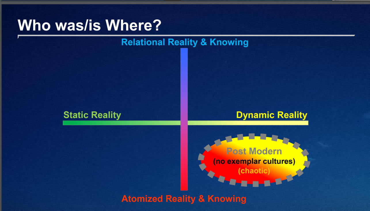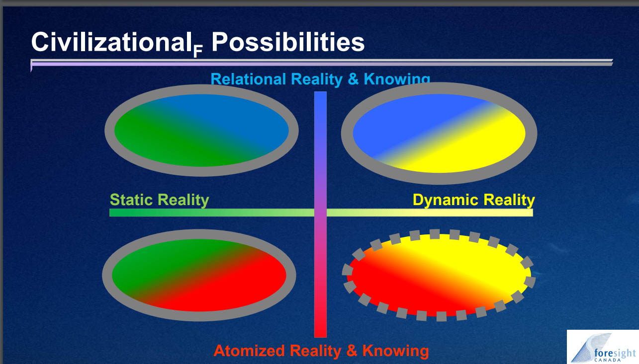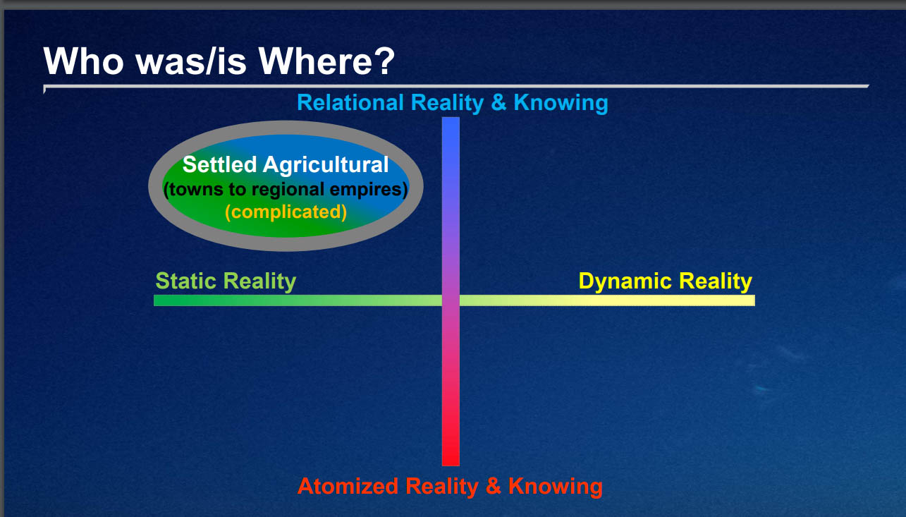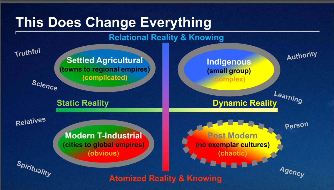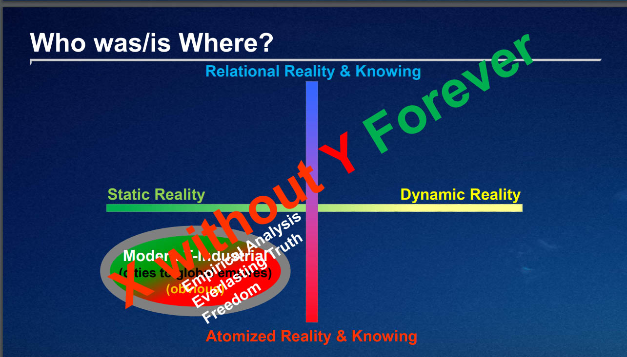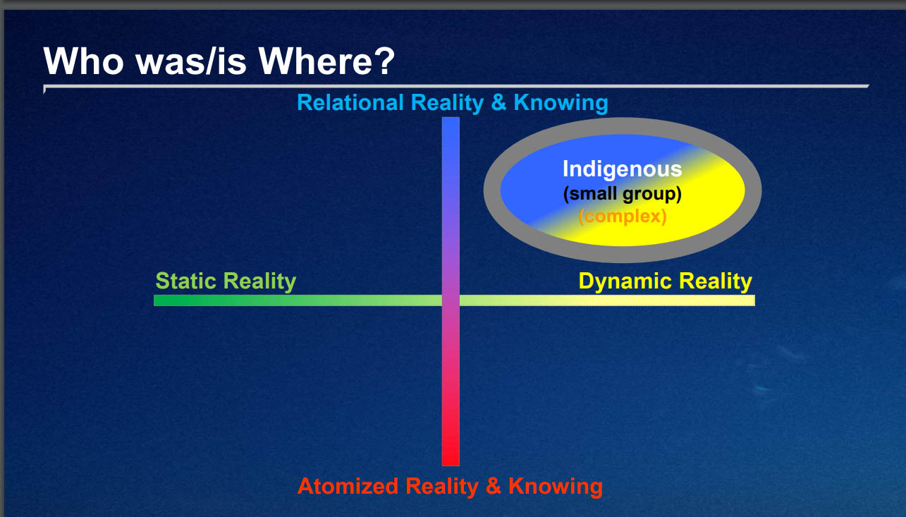 It's not as if we just all are going to become like the Stoney-Nakota, and as their forefathers did, heat rocks and put them in a pot to boil water, but that's the epistemological and logical space, and if you understand that then what you're looking for is teaching people in their own life, in their own personal experience, in their own relationships, in the reading that they do, in the novels that they read, we're getting them to develop the cues to see the ways in which the modern world is really deeply modern, that it really does reflect the assumptions of that bottom left-hand corner, because that's comforting in a way that we're actually learning who we are, but we're also can see the way in which we're struggling towards so that people who talk about community, you see a lot of that, saying that community matters, that we have to go local for all kinds of reasons. If you know the model, you can help teach people that communities are inherently relational so that any move that is inherently relational, whether you're doing it in theoretical physics, whether you're doing it in terms of energy grids, whether you're doing it in terms of human relationships, any move that is more inherently relational is a good move, and so what we're going to be doing is journeying and getting better at doing the journey into space that is more relational and dynamic, and we won't know what it is in a sense until we've been there and live it for a while, to say, oh, this is what it is kind of writ large, but that's generations ahead of us