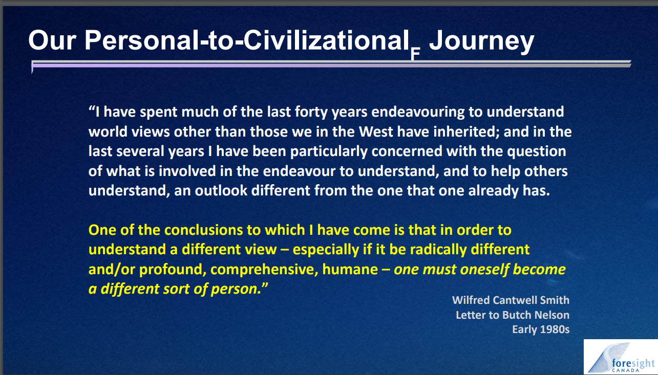 Wilfred Cantwell Smith, great historian of religion, Canadian, died in the year 2000, wrote me a letter in the early 1980s when he was the head of the founding head of the Harvard Institute of the Study of World Religions, saying, Butch, which is how he knew me, I've spent much of the last 40 years endeavoring to understand world views other than those that we in the West have inherited, and in the same, in the last several years, I've been particularly concerned with the question of what's involved in the endeavor to understand and help others understand an outlook different from the one one already has. And one of the conclusions to which I have come is that in order to understand a different view, especially radically different and or profound, comprehensive, humane, one must oneself become a different sort of human.