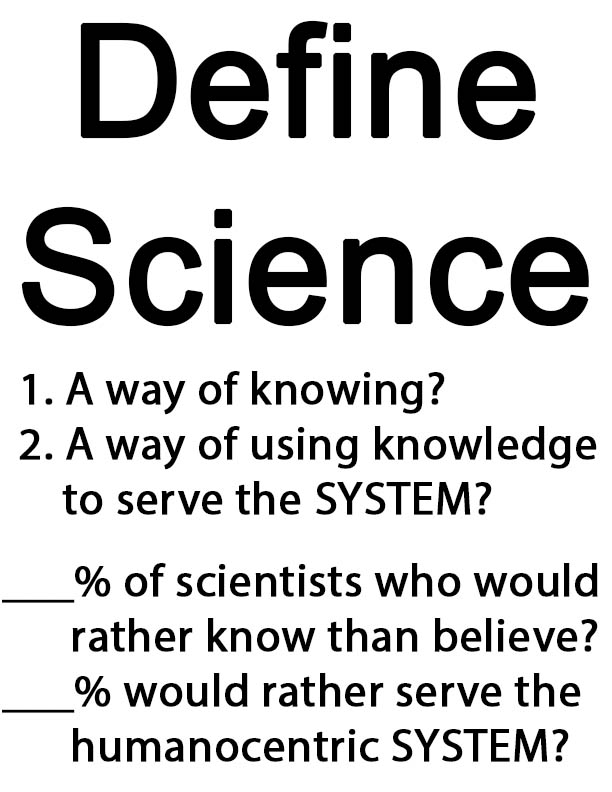 The third question fails to be clear. Most scientists, concerning matters within their field or specialty, would rather know than believe, because that's what the subSYSTEM of science tends to select for, so a 99% would be a reasonable figure. What I was thinking about, however, is the percentage who, across the board in matters of science, politics, religion, history, current affairs..., would rather know than believe as dominate concern, which has nothing to do with self interest. Those for whom science serves their self interest, predominately in ways that matters to them, fall into the last percentage as one can be rewarded only by serving the SYSTEM that serves humanity's interests unless one is up for a life of crime (defined as behavior that does not serve the SYSTEM but harms it) or one is okay being homeless or otherwise living a marginal life on the periphery. Go to any big city. Consider the high cost of living there most pay. How do they pay? They serve the SYSTEM.