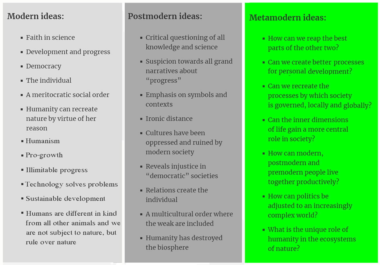 The post-modern attitude defines itself as an antithesis to modernism. It berates the modernist utopian project and uncovers its hideous injustices and destructive tendencies. Postmodernism seeks to explain everyone’s worldview as a product of their social and cultural conditioning: inherently limited, biased and relative. Ultimate truths and absolute values are torn down and hacked apart. Postmodernism’s great project of deconstructing modernism has resulted in an allergy to actively upholding its own values by attempting to build a society on them. Such utopian projects are seen as naïve at best, and at worst, totalitarian or Machiavellian: who are you to tell me the world should be like this? Look what happened last time we shot for utopia! Colonialism, communism, capitalism… stop the madness! Can’t you see utopias are dangerous?! [utopia is a condition of long-term prosperous living that Nature selects for, and humans can but guess then test; they don't get a vote as to what works]